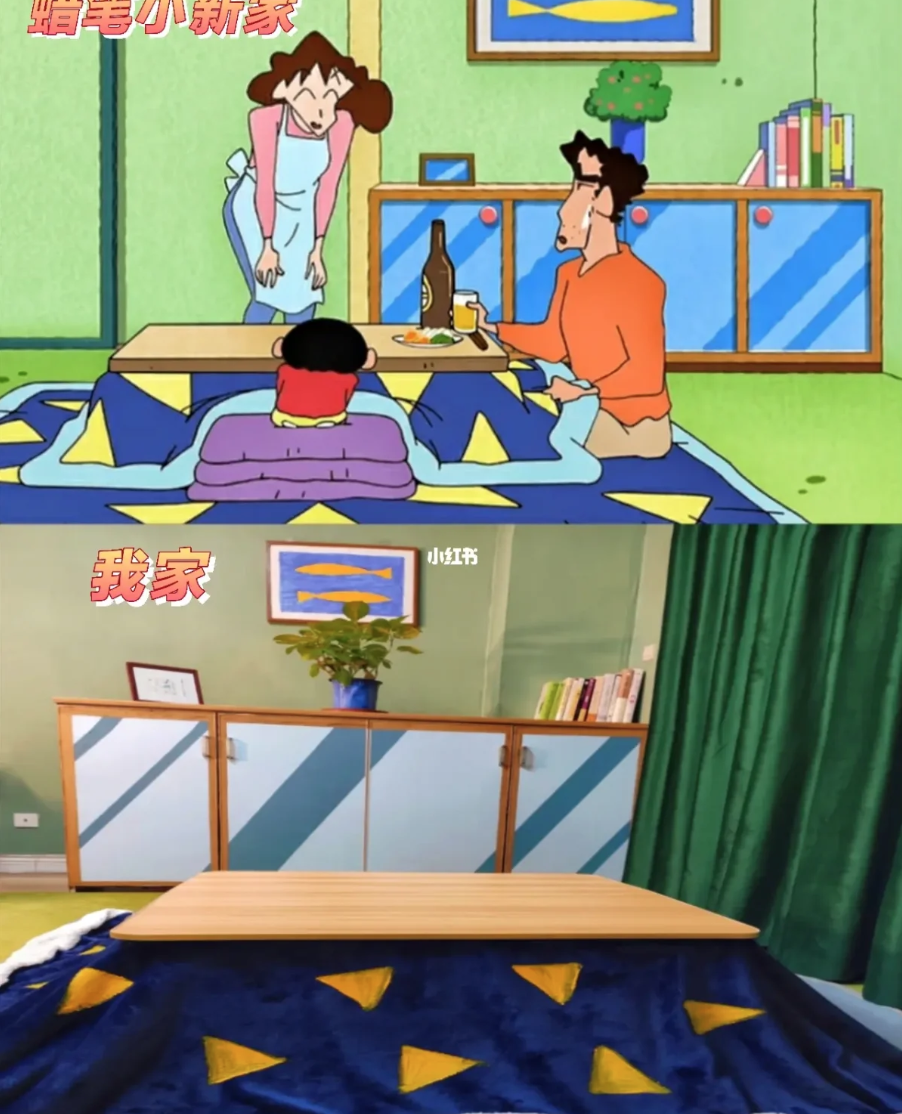 最厲害的地方是連小新家的戶外花園也長得一模一樣,最經典的就是那個深藍色的暖桌啦!不知道哪裡找來的同款三角圖案暖被,一看到這個就很有蠟筆小新漫畫裡的感覺了!