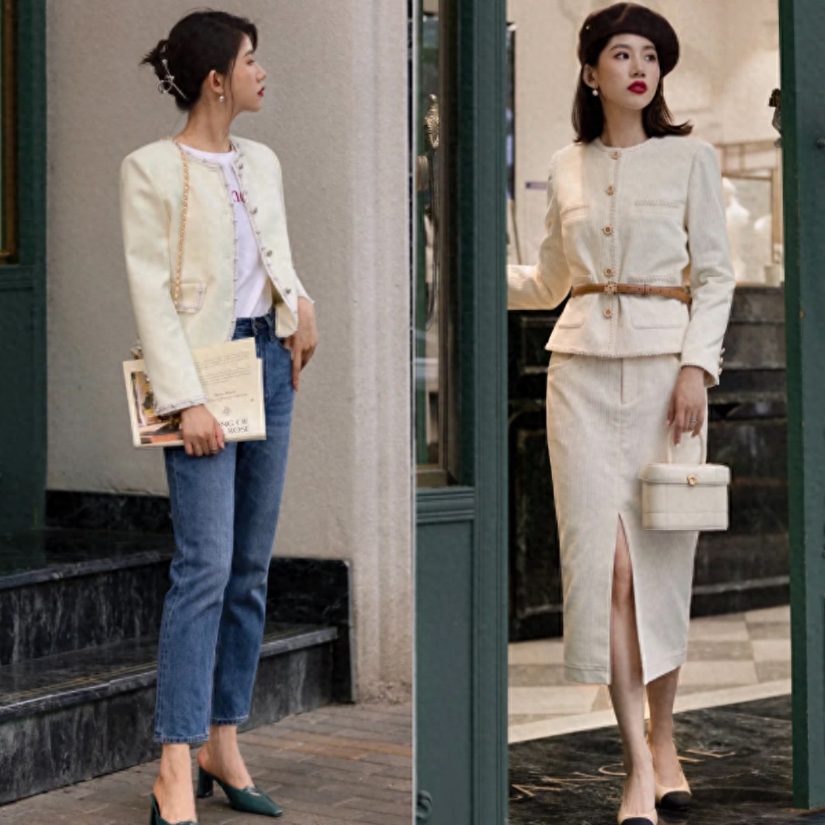 組合模式一、小香風外套搭配「牛仔褲」or「直筒裙」