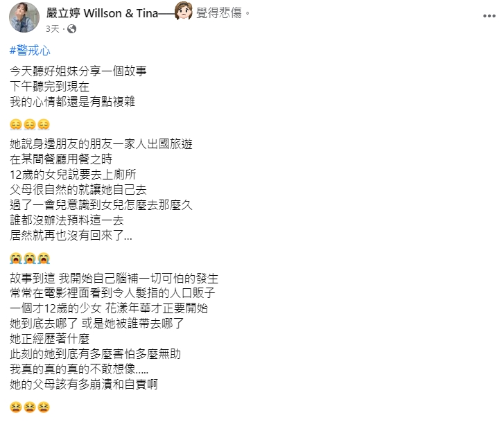 全家出國旅遊「12歲女兒去廁所再也沒回來」 嚴立婷痛心:「別讓孩子離開視線」