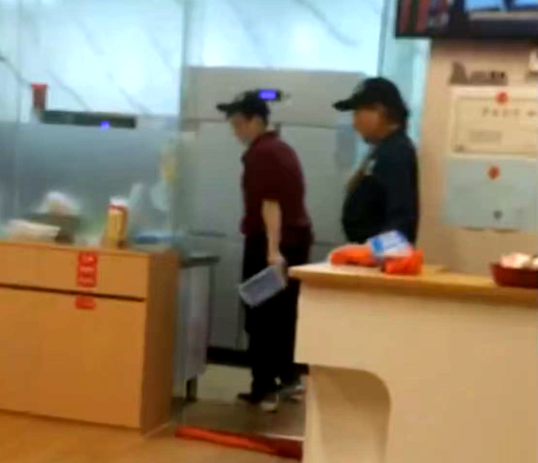 看畫面網友應該是偷拍,麥家琪像平常一樣,在店裡面工作,跟店員聊天。