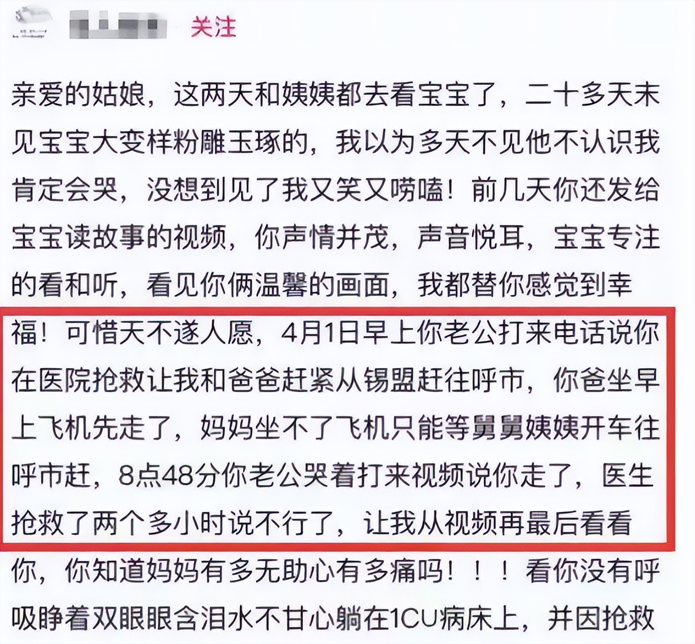 ICU裡,醫生爭分奪秒搶救兩個多小時,終究沒能留住這個年輕的生命。張筱雨的父親接到消息後,立刻買最早的機票趕往醫院;母親因身體原因無法坐飛機,乘車趕往呼和浩特,卻終究沒能見女兒最後一面。