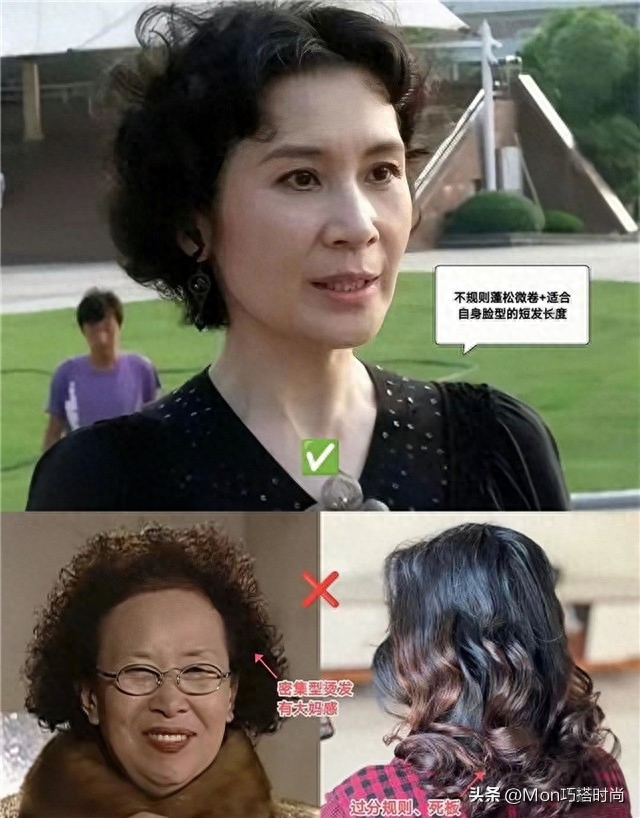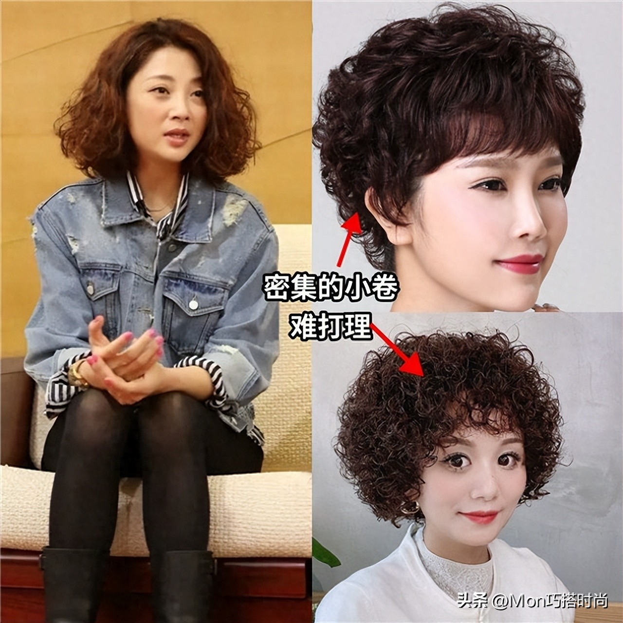 無論是這種過於密集的小捲髮,還是過分規整的捲髮都容易顯老,很多女性為了髮型好打理會選擇這種非常具有規則的捲髮弧度,看似這樣的髮型能夠修飾我們的臉型,但其實這種捲髮由於弧度太均勻,反而會覺得過於死板缺乏靈動自然的感覺,對於臉型的修飾效果也不好。