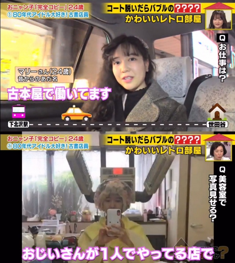 節目組日前就在路上發現了一個獨特的女孩,今年24歲Marie(マリー)是一間二手書店的店員,令人注目的是她整個人散發著「復古」的氣息,不僅穿著昭和風格的淺粉紅色oversize西式套裝,連髮型也是少見的蓬鬆鋼絲頭!