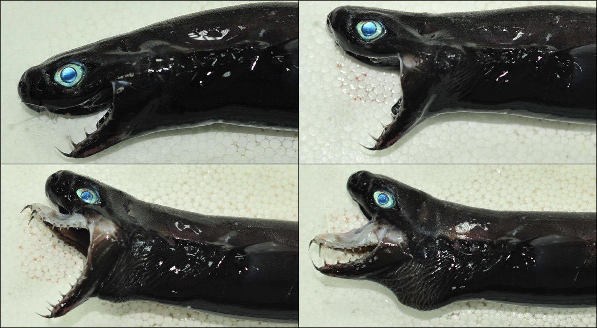 日前,一名網友在Twitter上發布一組照片,圖中的主人公是一條形象怪異的魚。牠全身皮膚是黑色、油亮狀,眼球與瞳孔則呈現淡綠、碧藍的奇異色彩,口部則有宛若毒蛇般的利齒在周邊擴散。此外,當這條怪魚將血盆大口張開到最大時,上顎的牙齦還會直接彈出來,彷彿脫臼般的詭譎樣貌,讓人感覺相當不舒服。