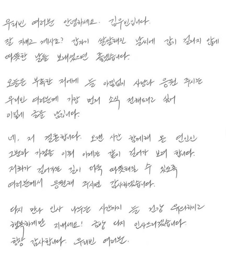 根據《ETtoday星光雲》報導,金宇彬於親筆信中先關心粉絲近況,提醒天氣轉冷要注意保暖別感冒。他接著表達感謝之情,「總是為還是有不足部分的我應援、給予愛意, 所以我想要最先向粉絲報告這個消息,於是就這樣寫下了文字」,字裡行間充分展現他對粉絲的重視與感激。