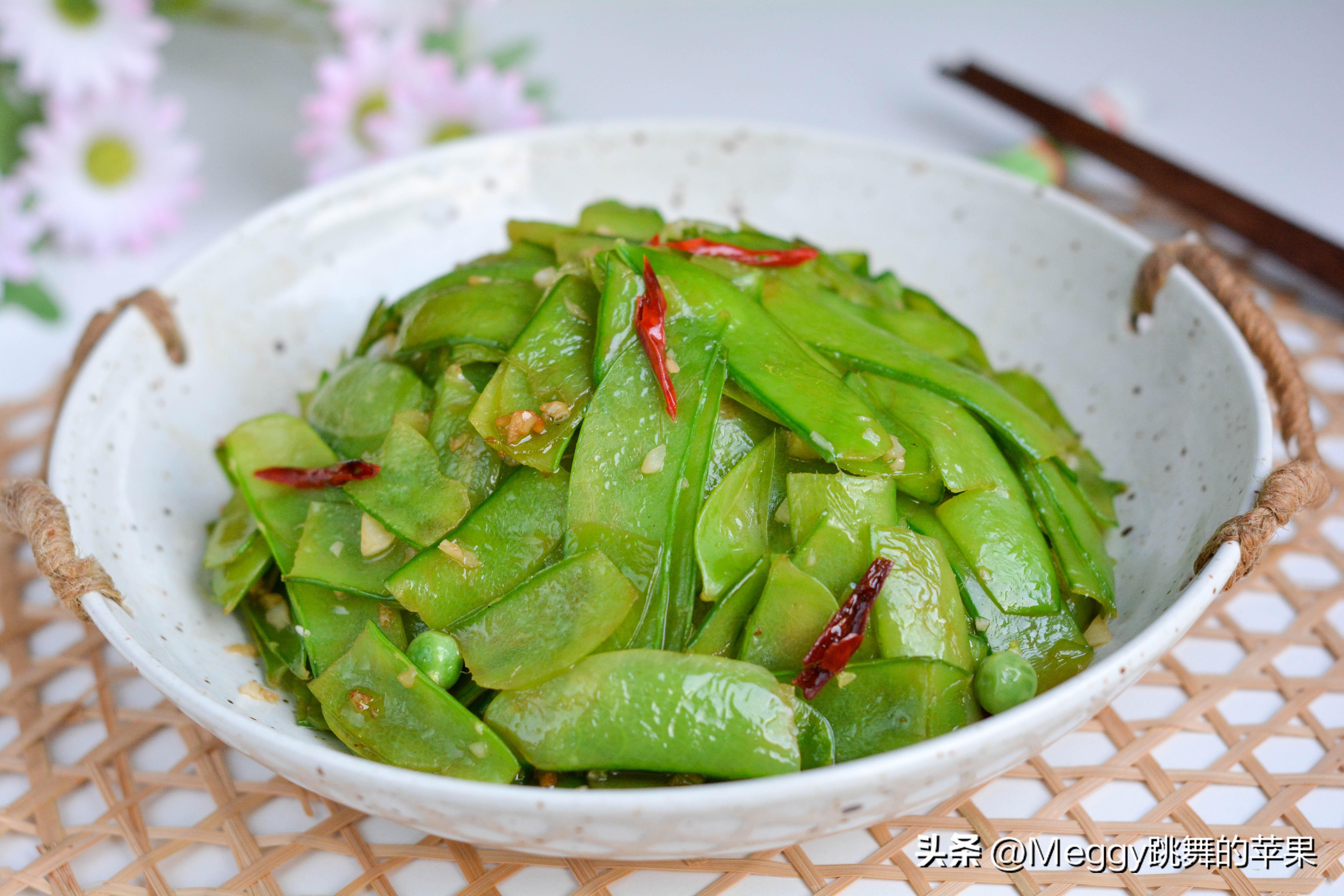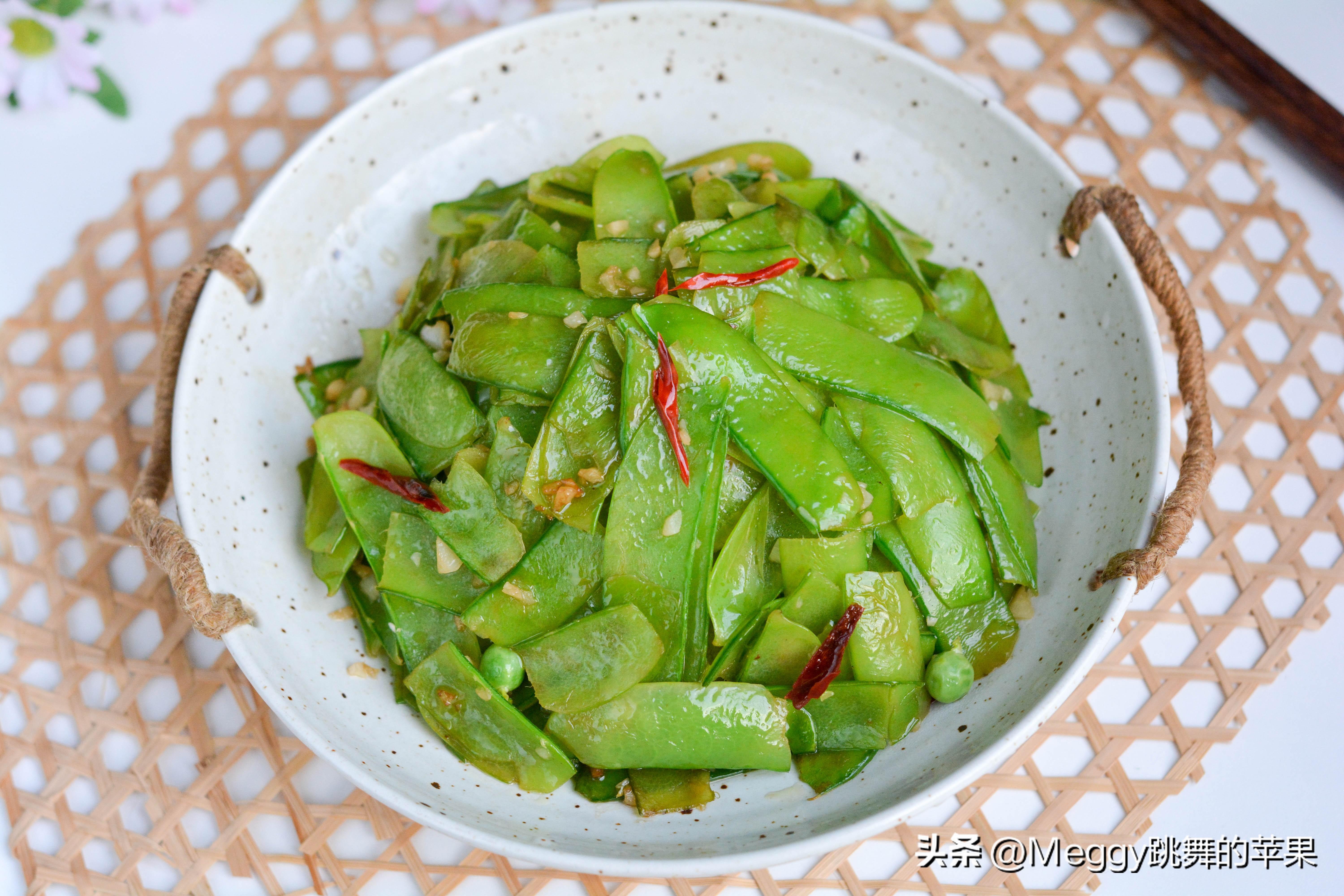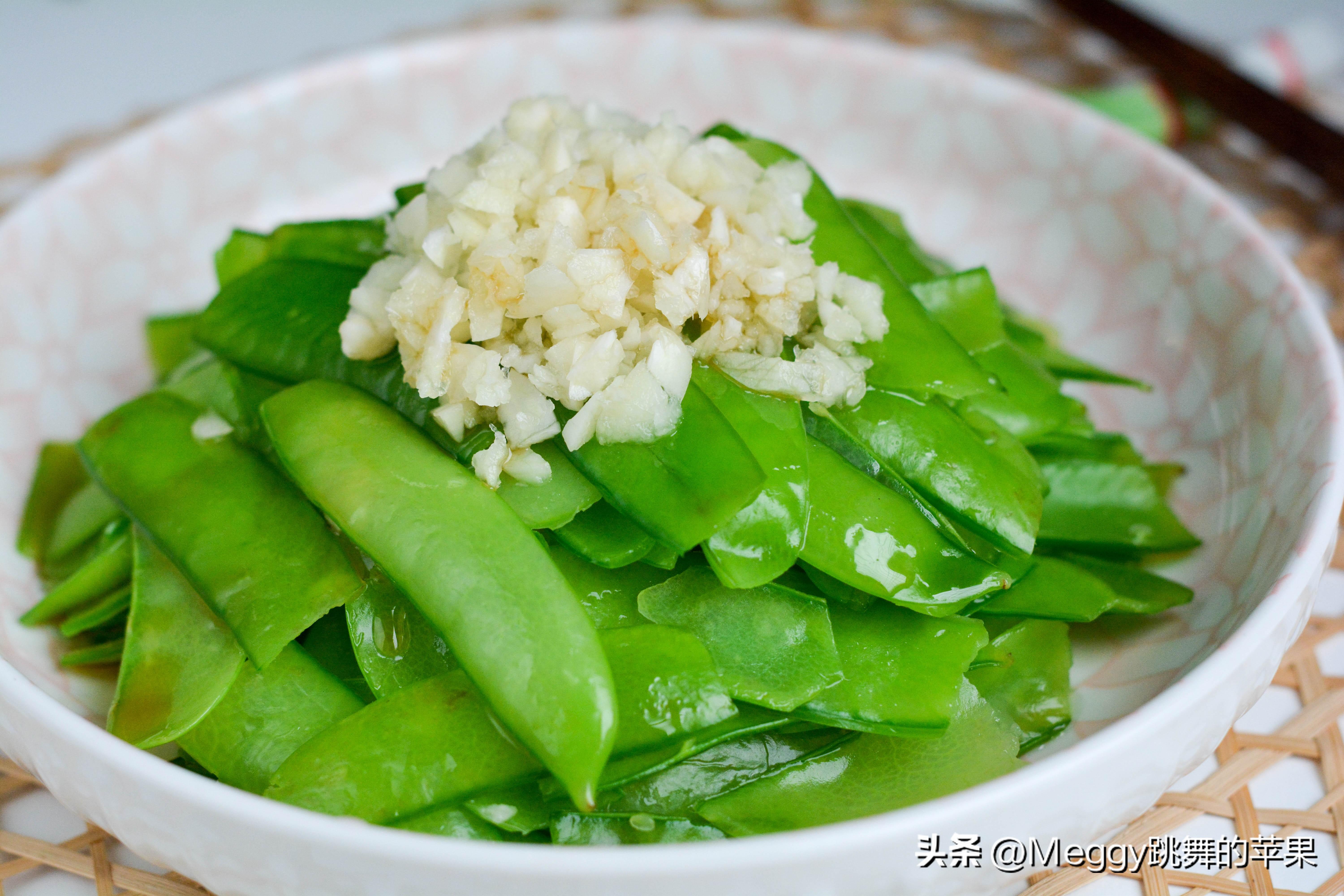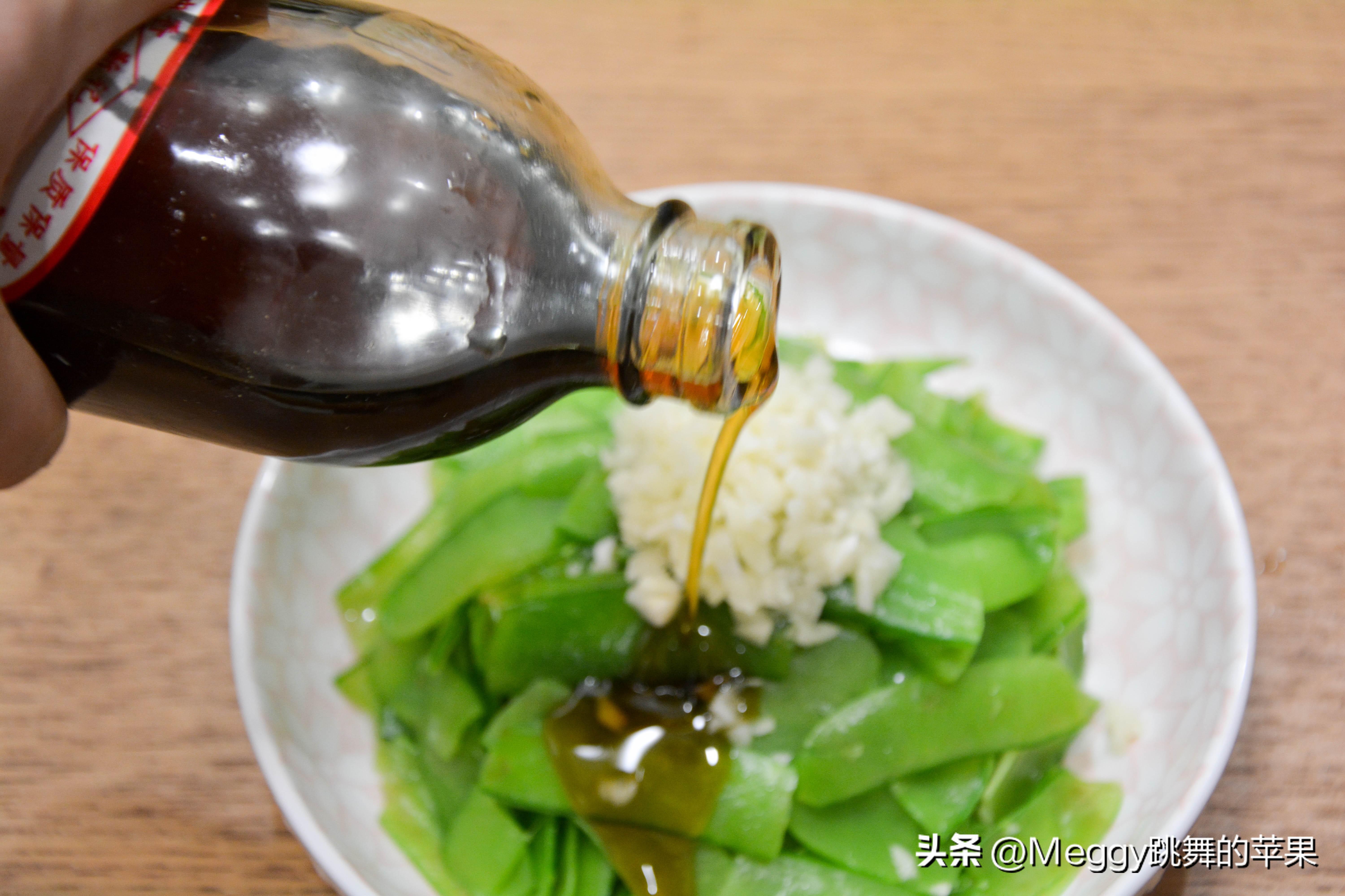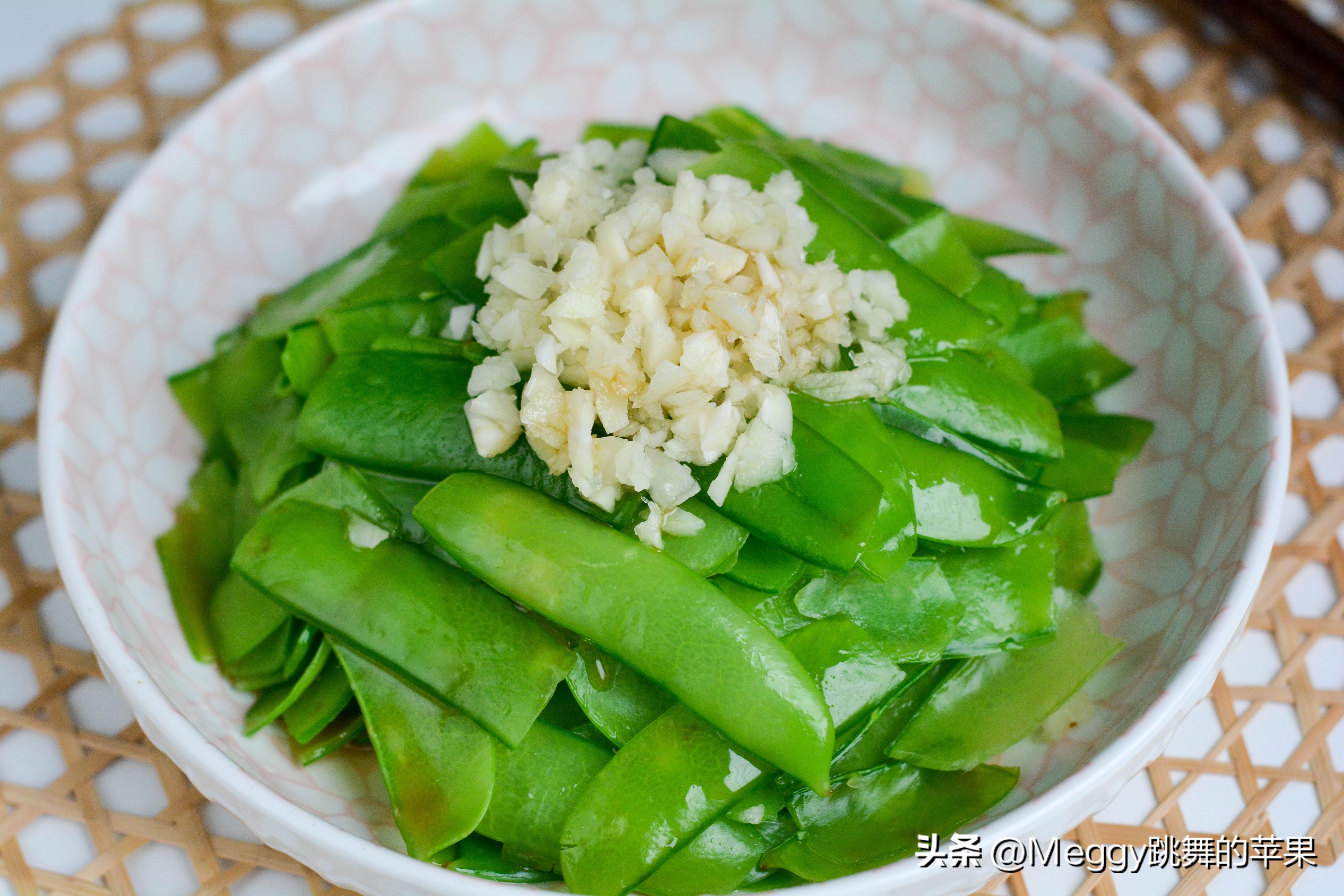 焯水後的豆莢顏色碧綠,脆嫩微甜,很像荷蘭豆的口感。加一撮大蒜末和香油同拌,微辣、香醇,開胃、順氣。