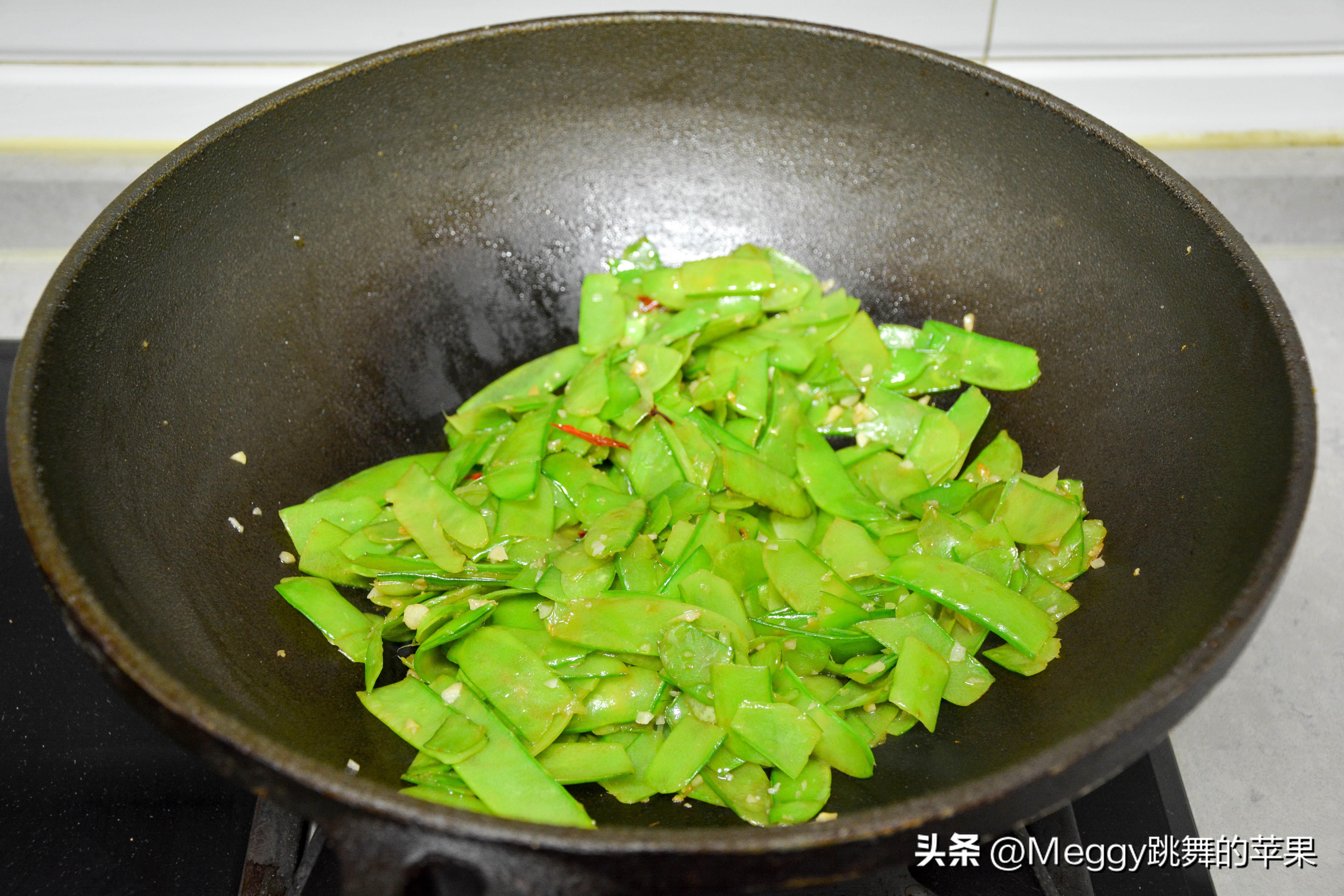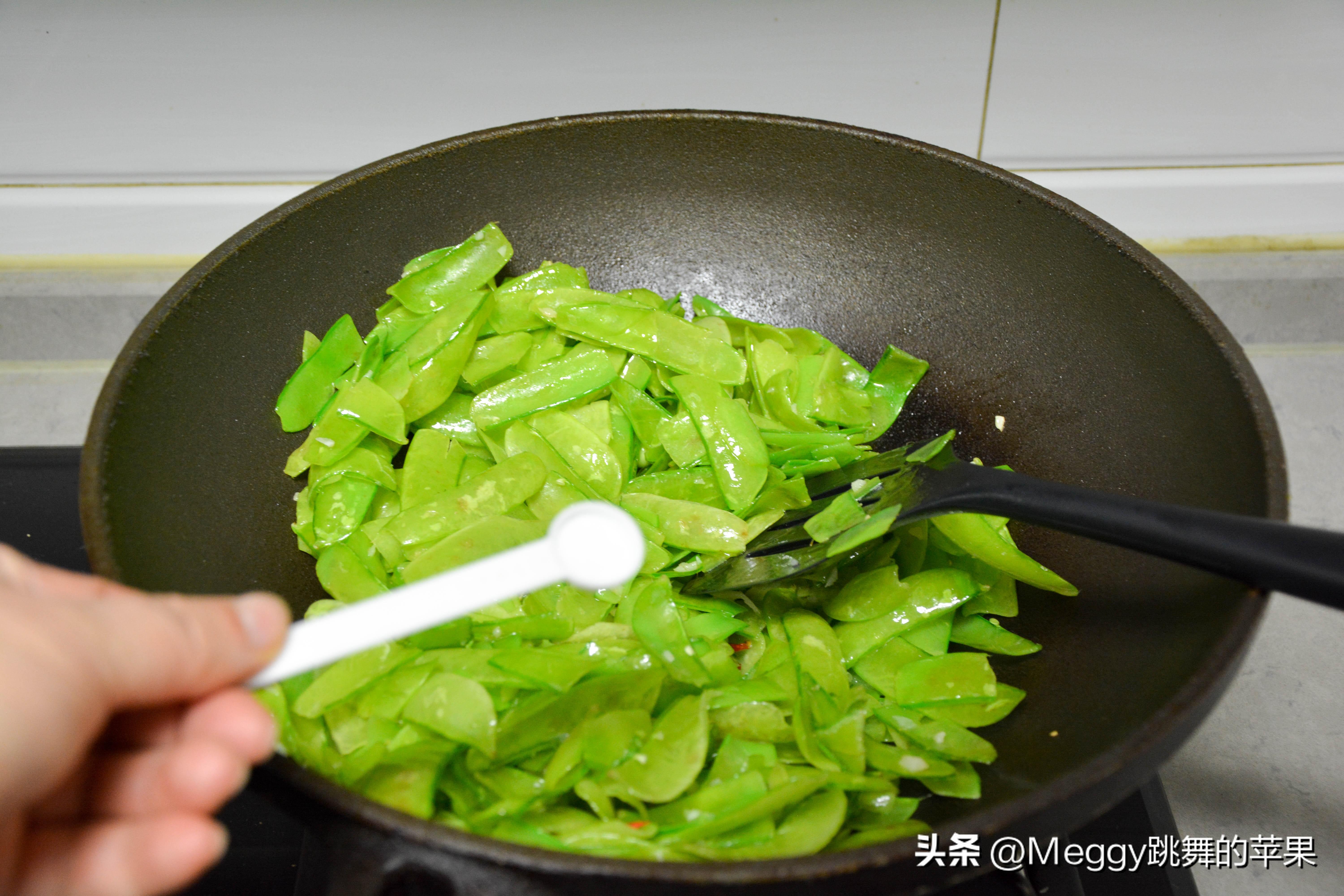 3. 倒入豌豆莢,翻炒1分鐘,加鹽;