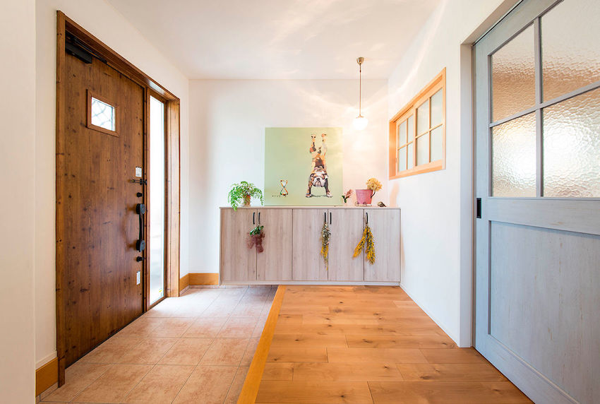 推開充滿鄉村風的大門之後,屋內的裝潢也可說是讓人瞬間眼睛為之一亮。玄關的部分以大面積的白牆與各種木質材料作為基調,使得整個空間充滿著一股溫馨的清新感之外,更是以鑲有毛玻璃的拉門隔絕LDK區域,讓整個空間配置可說是進可攻退可守般地,在達到強調隱私、區隔空間功能性的同時,又因為通透的設計使讓整個環境看起來更加寬敞~