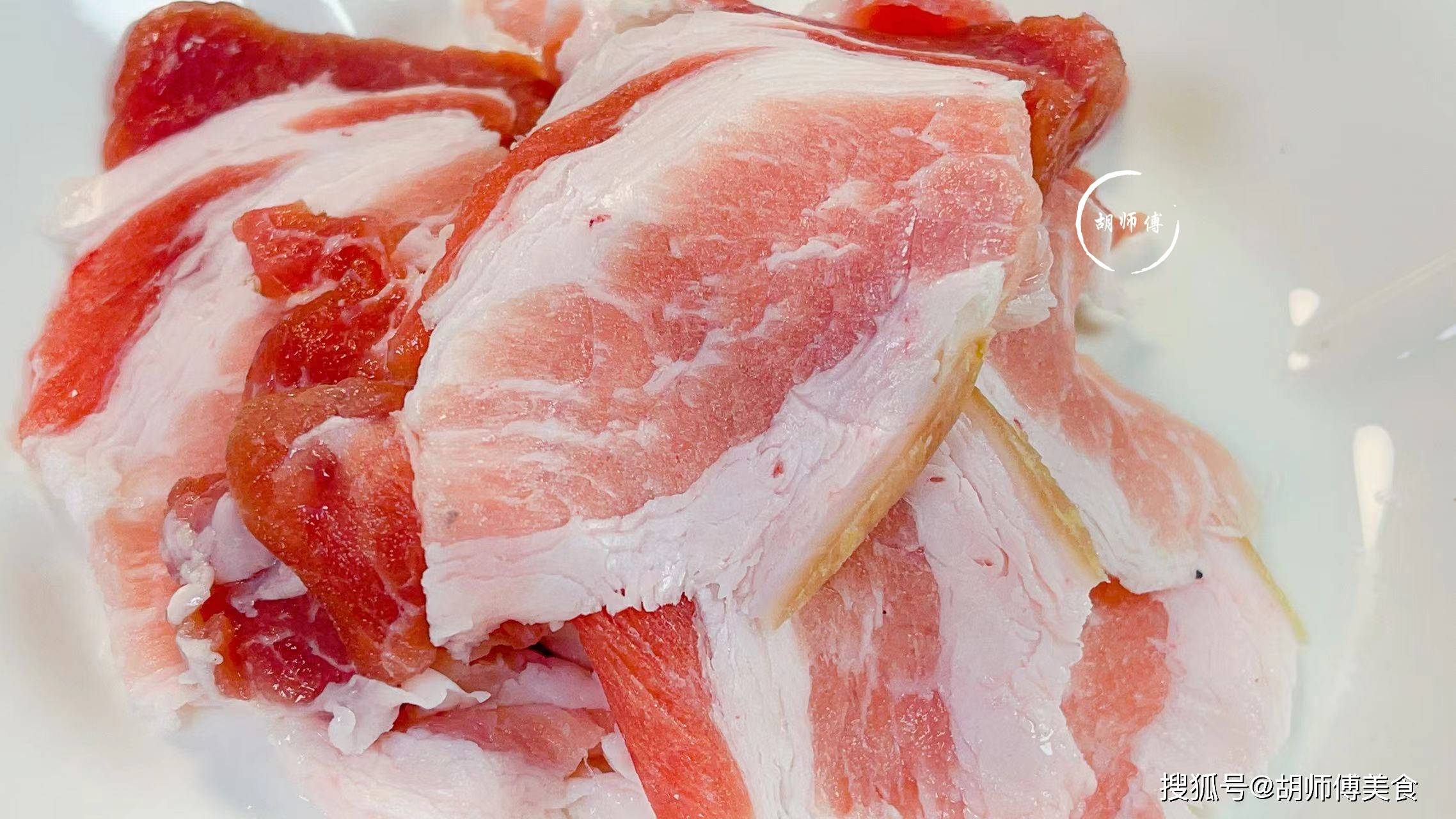 第二步:把五花肉去皮後沖洗乾淨,然後把五花肉放入冰箱中冷凍1小時,冷凍過後的五花肉更容易切,而且切的時候不會滑,接著再把五花肉切成0.3厘米厚的片狀備用。