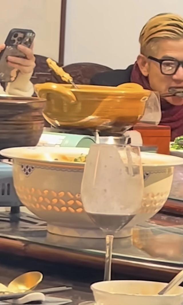 郭富城吃飯時依舊戴著眼鏡,沒動筷子之前他就看到對面有人在拍,有點不開心了,翻了下眼皮。