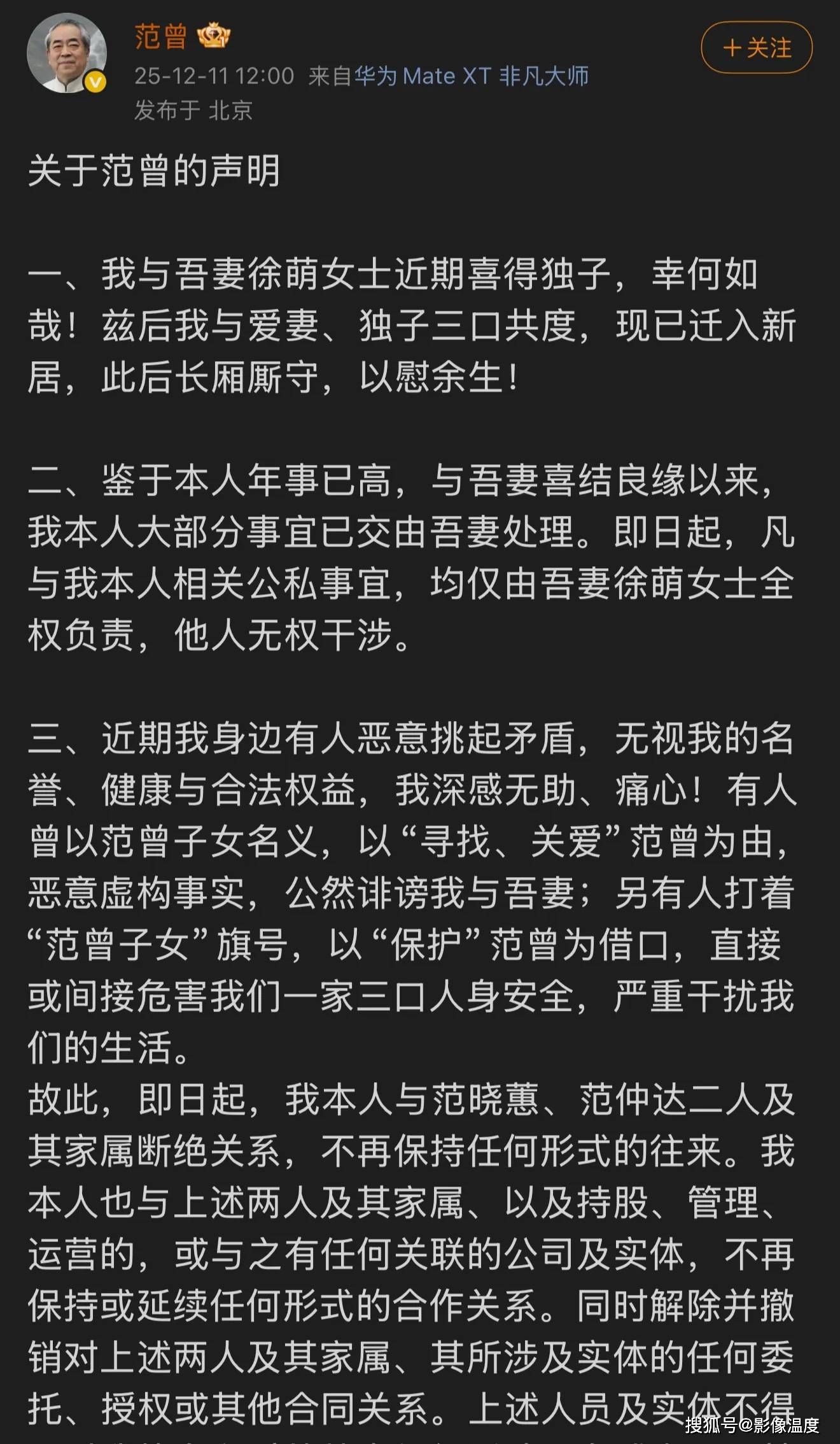 范曾同時對身邊有人以范曾子女的名義,打著「關愛」、「尋找」的旗號,誹謗自己和妻子徐萌,他深感不滿,宣布從12月11日開始,與范曉蕙、范仲達等親屬徹底斷絕關係,不再保持任何形式的往來。