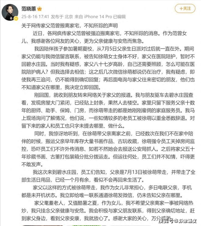 今年八月,范曉蕙說父親疑似被繼母徐萌挾持的事情,沒有想到,年底徹底反轉,范曾根本不領女兒的關愛之情,他和妻子徐萌搬了新家,他們沒有失聯,而且有了1歲的兒子,他現在只想和徐萌、兒子一家三口過好日子,他公開與女兒等親屬斷絕關係!