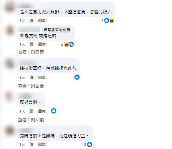 照片曝光以後,立刻掀起熱烈討論,至今已吸引6千多按讚數,網友紛紛表示「賣的其實是麵皮」、「這技術真好,薄成這樣也能炸」、「有時吃的不是雞排,而是精湛刀工」 、「皮跟肉還是分開的,是我最討厭的那種雞排」、「80買的是炸麵皮,雞肉的部分其實是回饋消費者的」 、「吃了個寂寞」、「算不錯了,有上、中、下三層」。