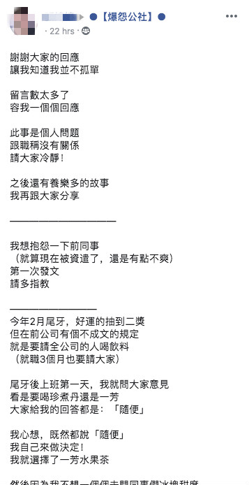 根據《ETtoday新聞雲》報導,這位網友在臉書「爆怨公社」發文,表示自己是公司的會計,她在公司的尾牙聚餐上,抽到了價值5000元的二獎,不過基於公司有個不成文的規定,就是要請全公司的人喝飲料,所以她在隔天上班後,就馬上詢問大家想喝哪一家飲料店,但得到的回答都是「隨便」,於是她就打算直接訂水果茶,連冰塊甜度都統一,這樣就不需要一個個紀錄,效率也比較高。