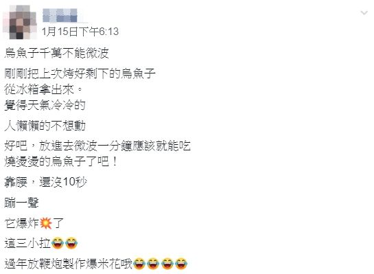 放進微波爐不到10秒,裡面立刻發出「蹦隆蹦隆」的聲音,讓她傻眼趕快打開爐門,才發現烏魚子根本就變成地瓜了。