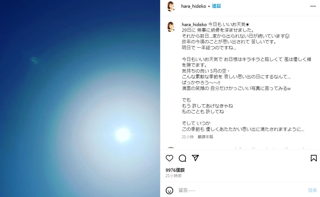 目睹老公家中輕生!66歲女星忍痛1年「終於放手下葬骨灰」 崩潰「連家門都走不出」:只想放過自己 Elmo 2026-01-21 檢舉 事實上,原日出子在老公離世後悲痛萬分,除了舞台劇的公演外,已經在電視圈消失好一陣子,後來接演日劇《逆轉交響樂團》,才終於正式回到大眾的目光,也讓很多粉絲相當替她感到欣慰,她也在貼文中,替自己加油打氣:「希望一天,在這樣的季節裡,能夠充滿溫暖又溫馨的回憶。」圖片來源:《自由時報》、《ETtoday》親眼目睹摯愛離世,真的很哀傷啊!資料來源:《ETtoday》 Advertisements 回首頁 2/2 Advertisements 猜你會喜歡 「女兒們,對不起!」44歲媽媽選擇「遠赴瑞士安樂死」 臨走前「向女兒們最後訣別」惹哭無數網友... 43歲台語歌手認了「拍戲遭排擠」 幕後主使者「竟是八點檔女星」 流水席很丟臉!未婚妻怨「一桌不到3萬能看嗎」氣PO對話 遭酸「那就別結了」網求放生男方 編輯精選推薦 More + 24歲兒失明!于美人爆「他在飯店掃廁所」維生 不盼紅包只求「別再花我的錢」 曾比江蕙紅!台語歌后「爆未婚生子」遭指指點點 「2次手術害癱瘓」72歲近況曝 趕在40歲前閃婚!八點檔女星「宣布嫁給他」 尪驚人身分曝「媒人是柯叔元」 晚年兒孫滿堂!73歲影壇大哥「拄拐杖現身」腳步蹣跚 兒子「全程攙扶不喊累」網羨:又帥又孝順 晚年隱居台東!68歲名主持失蹤「車內身亡」 伴侶悲曝「死前做1事」:還掛念著我 婚變尪落跑!單親媽「獨扛千萬債養孩」到處躲黑道 「一開口驚艷眾人」熬成台灣歌后 85歲失智父身亡!林葉亭突宣布「皈依佛門」 遇大師「開示一番話」忍不住淚崩 快養不起小孩!本土男星「開計程車、斜槓房仲」 突宣布「離開台灣」:演藝圈沒工作 最新/賈靜雯深夜慟曝「她已離世」 淚PO合照喊:真的好愛你... 弟成植物人、姊猝逝!玉女歌手「遭前夫設套」騙走娘家房產 「狠斬16年婚姻」近況曝 以為只是小感冒!本土女星悲痛證實「他併發肺炎過世」 一度淚灑現場「後悔同意插管」 大咖男星妹妹出嫁!全身金飾「曾獲近千萬豪宅」嫁妝豐厚 兄妹長超像「一看媽媽懂了」:基因強大 離婚18年!前夫早知方文琳罹癌「願意付手術費」 「1理由遭拒」爆她術後狀況 台灣大咖病逝「享壽83歲」!周遊告別式痛哭「認婚內出軌」:兒子很恨我... 功德圓滿了!台語歌后「悲曝他離世」享壽95歲 淚喊:去當快樂的神仙吧... 瞞病情積極工作!51歲影后「住院照曝光」眼神充滿光 丈夫悲慟「臨終前吃流食」:仍盼奇蹟降臨 當年親吻1歲嬰!42年後「對方竟成巨星」同框劉德華 「超高顏值如兄弟」粉絲喊:真的差19歲? 空窗多年!68歲陳美鳳突羞認「身邊有個他」 40年前就認識「遭男方母親拆散」 22歲愛女病逝!資深男星「走不出喪女痛」留白長髮現身 掛骨灰項鍊「代女做1事」惹淚 最新/3度中風送醫!資深男星爆離婚「斷50年髮妻」 「砸1億淨身出戶」家族爆紛爭 65歲男星獨居暴斃!大咖女星放下恩怨「送前夫最後一程」 昔遭動手6年嘆「死者為大」 15歲兒「睡夢中離世」!本土女星「送愛子火化」求做1事 「PO照圓滿了」:媽媽和你永不分開 破解張文電腦「犯案動機首曝光」!搜尋紀錄「滿滿女性關鍵字」檔案藏震撼照片 再婚2年了!43歲李燕突喊「當媽媽實在太辛苦」 認「已經有愛的結晶」:最完美的幸福❤️ 李英愛輸了!73歲富商尪「超凍齡像40壯年」站一起超登對 「不時甜蜜咬耳朵」網羨慕