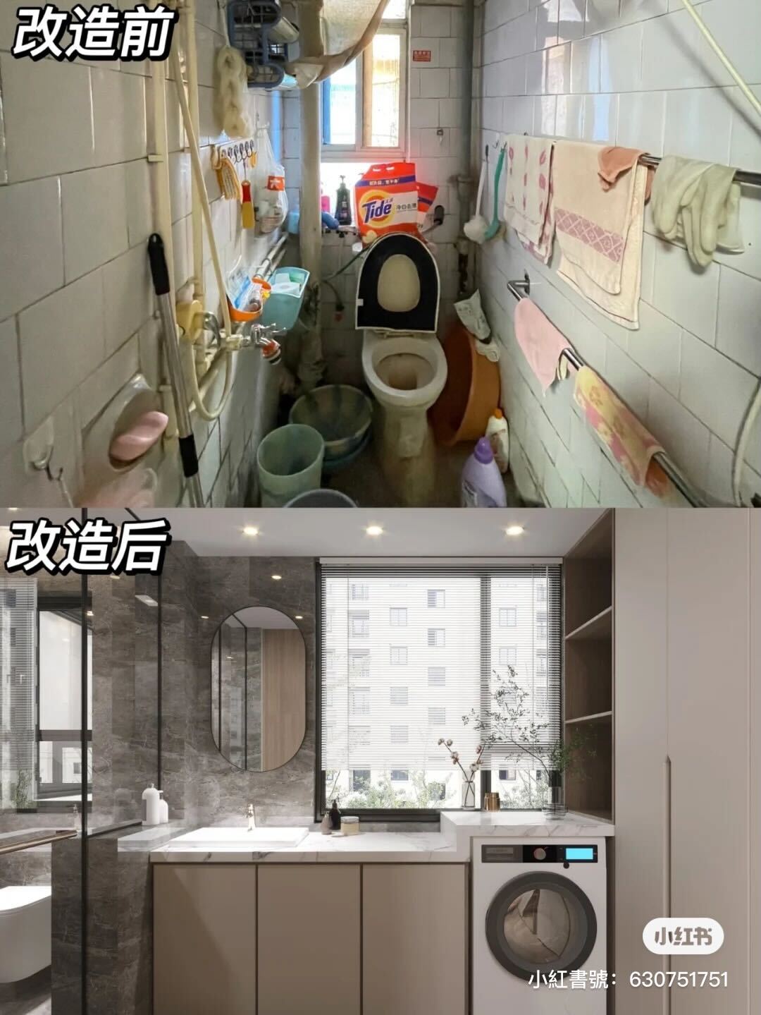 牆都打掉後浴室廁所善加利用空間,中間更藏有洗衣機~