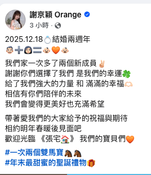 謝京穎在貼文中掩飾不住喜悅心情,將即將誕生的這對雙寶形容為「年末最甜蜜的聖誕禮物」,關於預產期,謝京穎與粉絲們約定「相約明年春暖後見面吧」,並俏皮標註「一次兩個雙馬寶」的標籤,證實將在龍年過後的馬年誕下雙胞胎,迎接一家四口的熱鬧時光。