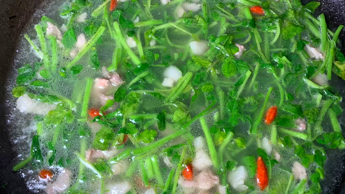 3、西洋菜炒軟後往鍋中倒入1大碗冷水,隨後再倒入少許的味極鮮、鹽和胡椒粉攪動調味,鍋中水煮開後,再放入清洗乾凈的枸杞粒,煮1分鐘關火即可。