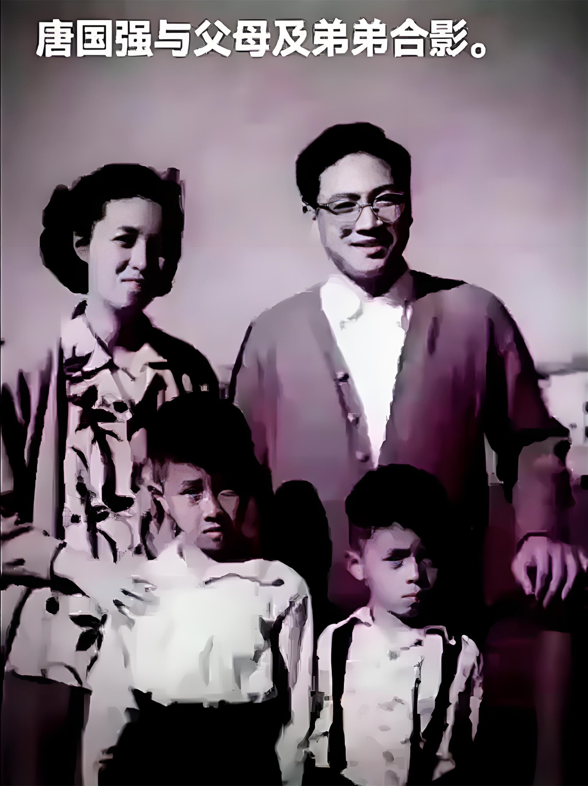 1952年5月4日,唐國強出生於山東省青島的一個知識分子家庭,父母都是醫務工作者,上圖是唐國強在幼年時,與爸爸媽媽、奶奶及弟弟所拍的一張全家福,父母身上充滿書卷氣,奶奶慈眉善目,而他和弟弟則眉清目秀。