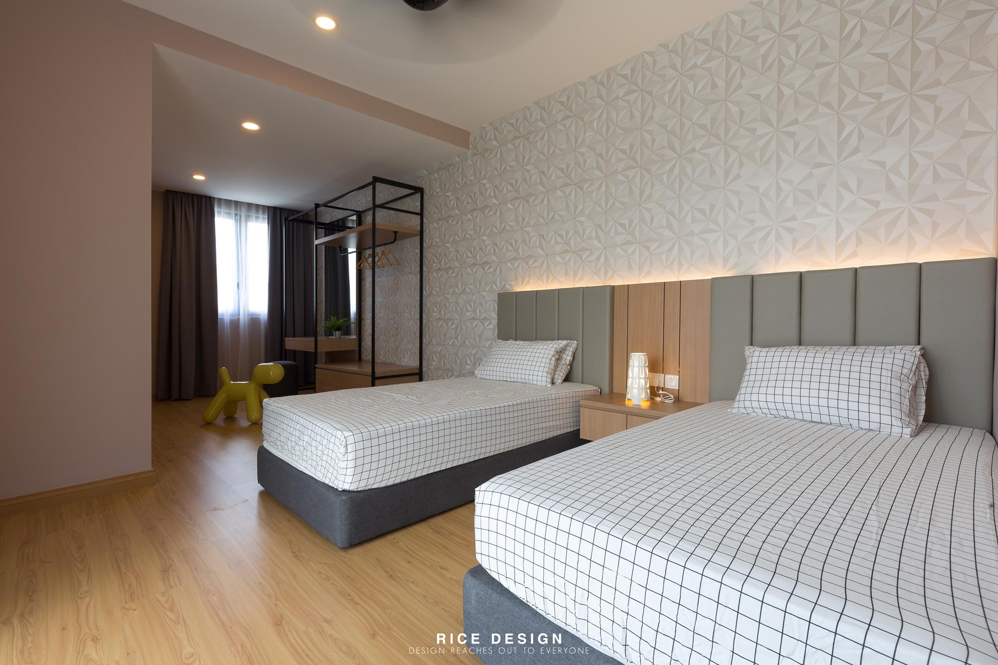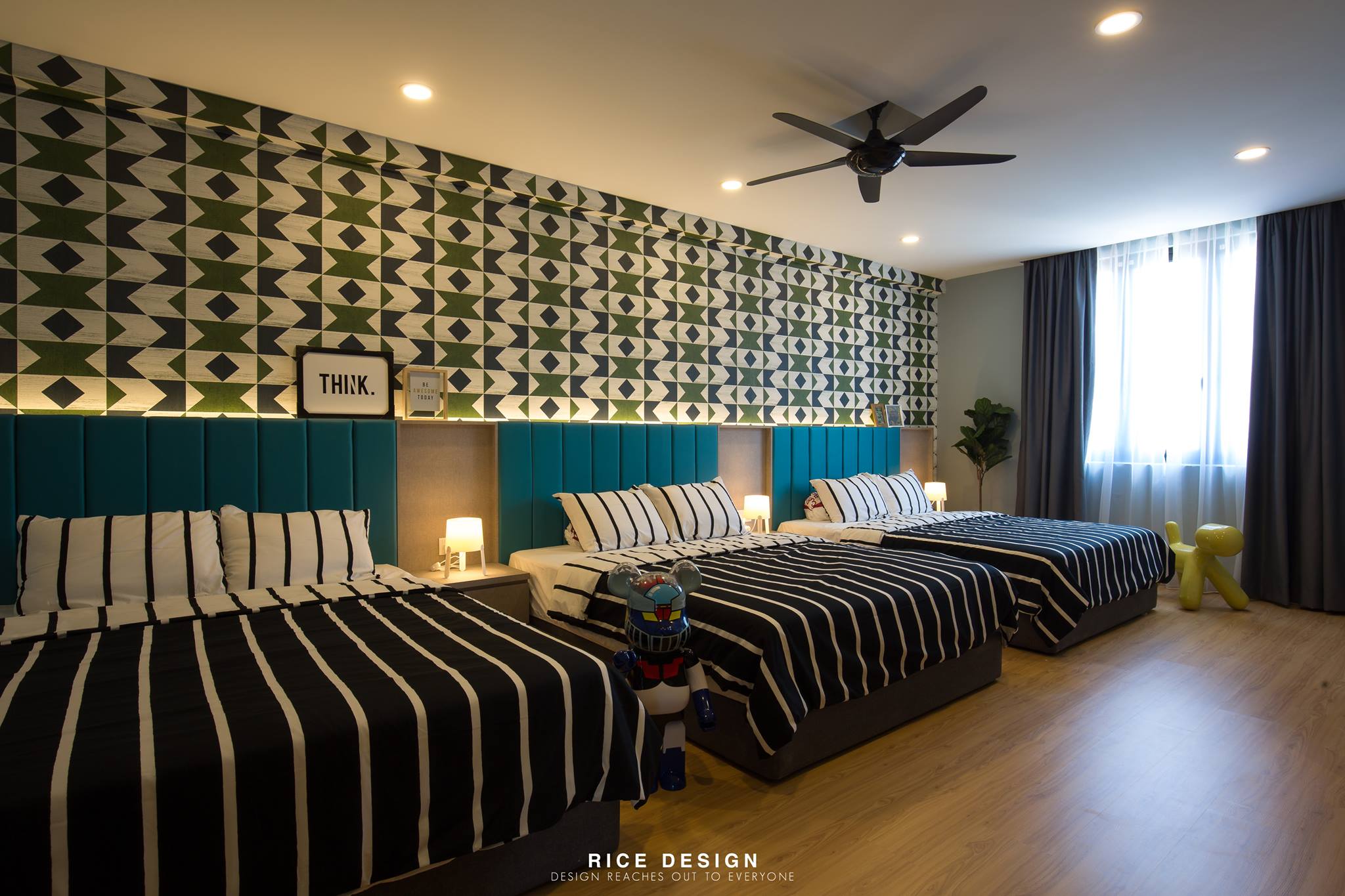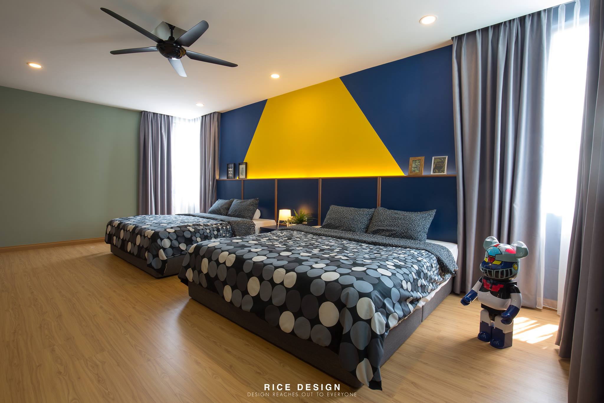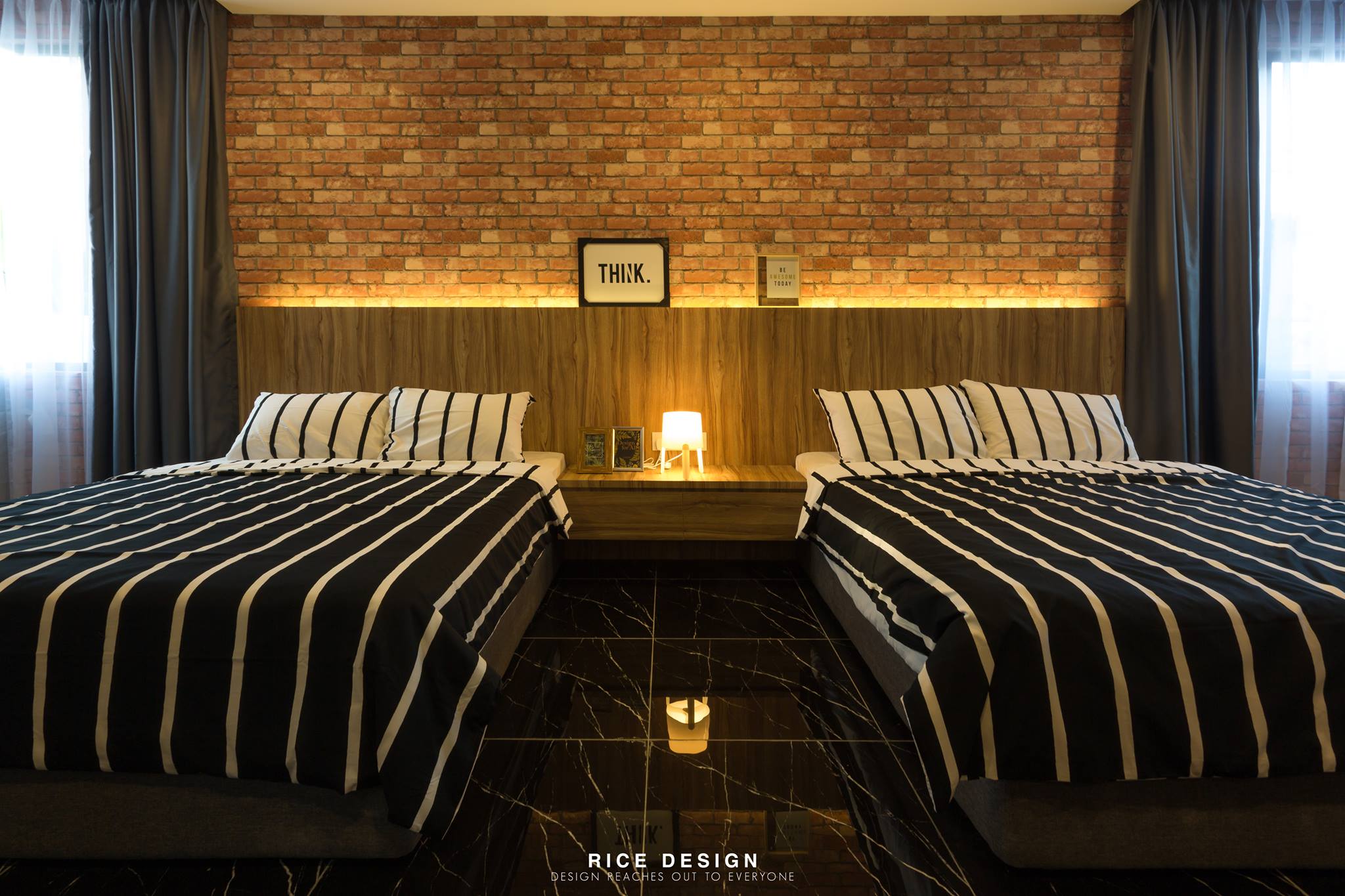 臥室的部分風格更有不同,團隊特地挑選幾何圖形製成的壁紙來裝飾,搭配條紋的床鋪床單,整體都很有走進美術館的感覺!另外還有日式簡約風格,雖然色調沒有這麼鮮豔,但象牙白加上木頭色的絕妙搭配,還是讓寢室的樣貌協調不少。