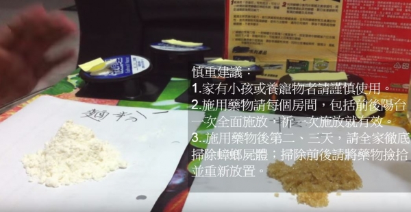 他表示製作「蟑螂炸彈」需要先買三種東西,一般市售蟑螂藥、麵粉和砂糖!