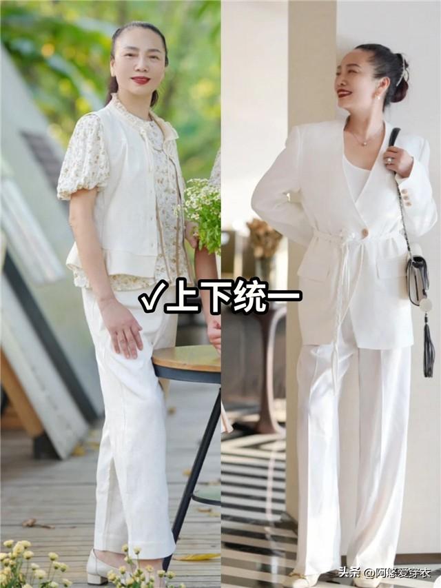 而且,要想擺脫老氣俗氣感,太艷麗的配色請你避免,太暗沉老氣的深色搭配也請你拒絕,可以穿夏季的清爽色系,比如白色系,米色系,搭配清新亮麗的流行色彩,凸顯出活力滿滿的年輕感,不經意間就可以減齡。