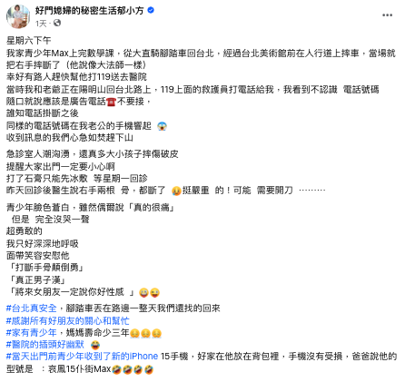 看著青少年的浪漫溫柔,郁方也深呼吸揚起笑容,幽默的安慰兒子:「打斷手骨顛倒勇」、「真正男子漢」、「將來女朋友一定說你好性感」話鋒一轉,也很感謝相關人士的關心與幫忙,也很訝異台北真的很安全,腳踏車丟在路邊一整天還能找回來,最後忍不住搖頭苦嘆:「家有青少年,媽媽壽命少三年...」