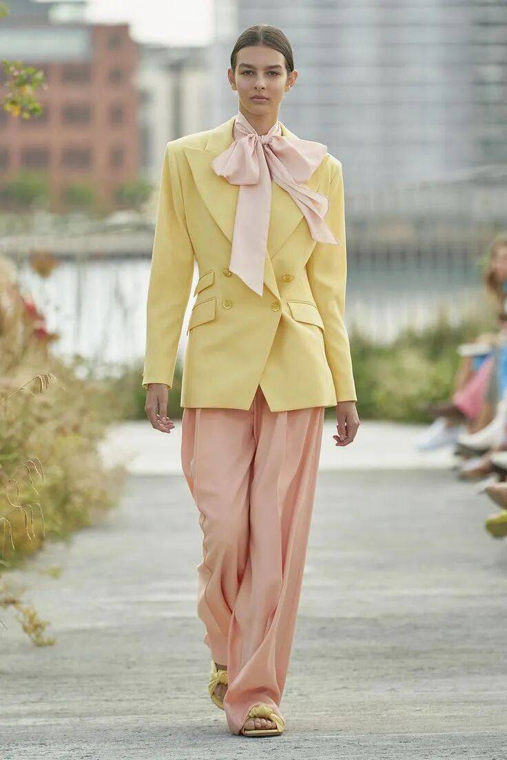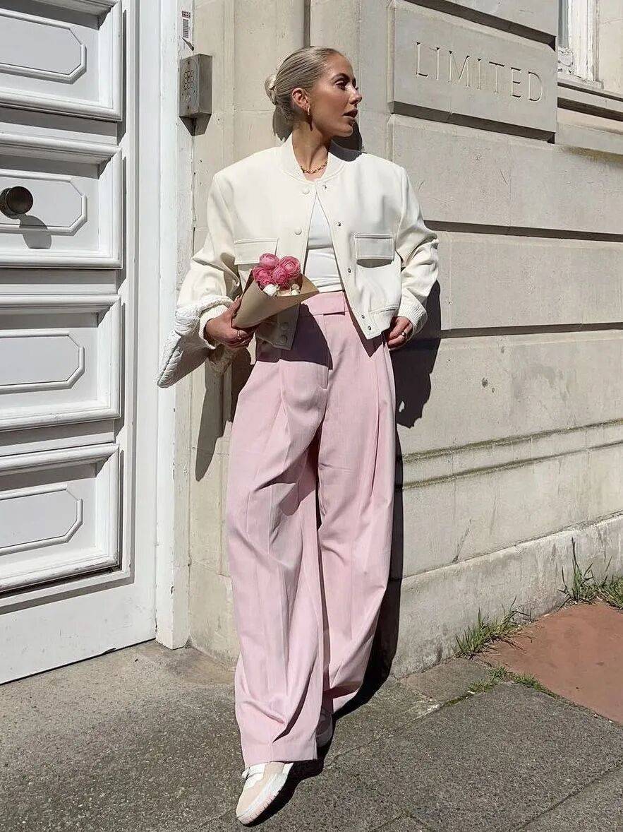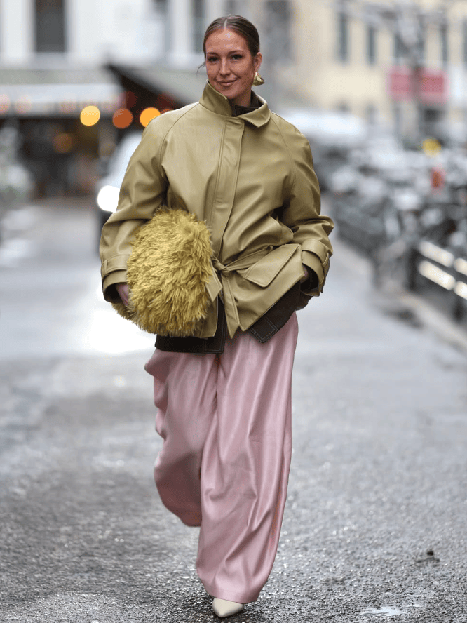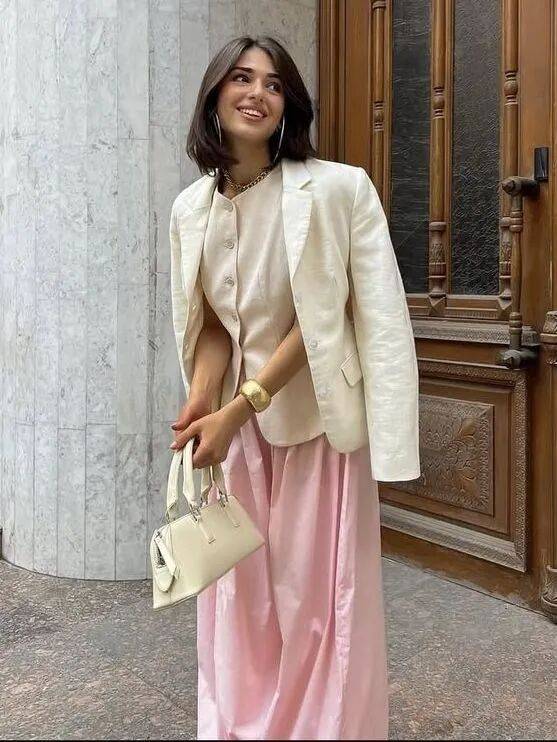 而低飽和的小雞黃外套+柔霧粉寬褲,不是那種濃烈的撞色,彼此滲透、互相映襯,明媚但不刺眼,甜美但不幼稚。