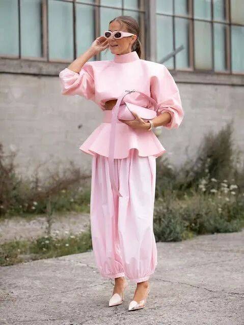 所以,當你決定pick同色系的搭配時,不妨試試有輪廓空氣感或垂墜面料的寬褲(泡泡褲甜美、拖地寬褲顯氣場),時髦得毫不費力。
