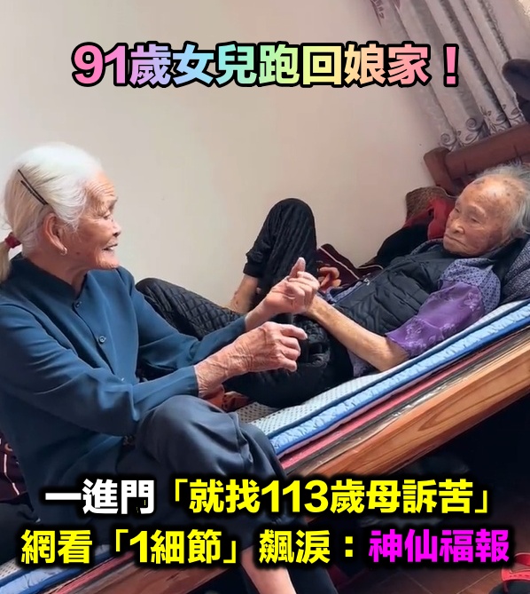 91歲女兒回娘家「找113歲母訴苦」!網一看「互動1細節」飆淚:神仙福報 中距離神射手 2026-03-18 檢舉 網友們看到這對高齡母女的溫馨互動,紛紛獻上祝福,「這是人間最奢侈的幸福,年紀再大只要有媽在就永遠有依靠」、「認識快一百年了還有聊不完的話」、「91歲還能和媽媽撒嬌是什麼體驗?也希望我的媽媽永遠健康長壽,平安喜樂」、「福報滿滿的兩母女」、「祝福兩位婆婆身體健康」。影片來源:中國新聞社 臉書看完影片突然很想念媽媽了!資料來源:TEEPR亮新聞 Advertisements 回首頁 2/2 Advertisements 編輯精選推薦 More + 65歲男星獨居暴斃!大咖女星放下恩怨「送前夫最後一程」 昔遭動手6年嘆「死者為大」 台語歌后慟別摯愛!告別式上認「早隱瞞病情」 道歉哭喊:原諒我簽放棄急救 離婚18年!前夫早知方文琳罹癌「願意付手術費」 「1理由遭拒」爆她術後狀況 24歲兒失明!于美人爆「他在飯店掃廁所」維生 不盼紅包只求「別再花我的錢」 趕在40歲前閃婚!八點檔女星「宣布嫁給他」 尪驚人身分曝「媒人是柯叔元」 慶祝17歲愛女畢業!53歲大咖「兒女皆讀名校」年花千萬 驕傲「她獲三大獎」:又美又自信 蔡小虎接噩耗「驅車360里路」南下見她最後一面 「堅持續命3個月」慘痛代價曝光 滿街都在穿!醫點名「這款鞋」少穿為妙:恐讓脊椎變形 教你「1招看腿型」秒挑到好鞋 晚年兒孫滿堂!73歲影壇大哥「拄拐杖現身」腳步蹣跚 兒子「全程攙扶不喊累」網羨:又帥又孝順 交往7個月就閃婚!小17歲妻遭質疑「嫁沈玉琳是為了錢」 婚後負債3千萬「芽芽一句話」網看哭 最新/賈靜雯深夜慟曝「她已離世」 淚PO合照喊:真的好愛你... 李英愛輸了!73歲富商尪「超凍齡像40壯年」站一起超登對 「不時甜蜜咬耳朵」網羨慕 弟成植物人、姊猝逝!玉女歌手「遭前夫設套」騙走娘家房產 「狠斬16年婚姻」近況曝 離婚11年!洪榮宏愛女結婚「終破冰前妻」 「2爸爸牽她進場」催淚畫面曝 擦1次窗28元!窮街友「想湊4000元買眼鏡」 挨家挨戶求打工「超商店員一聽突伸手」百萬網友看哭 以為只是小感冒!本土女星悲痛證實「他併發肺炎過世」 一度淚灑現場「後悔同意插管」 大咖男星妹妹出嫁!全身金飾「曾獲近千萬豪宅」嫁妝豐厚 兄妹長超像「一看媽媽懂了」:基因強大 旅美多年!資深女星「堅持落葉歸根」回國5天安詳離世 死前「砸600萬做1事」眾人淚目 再婚2年了!43歲李燕突喊「當媽媽實在太辛苦」 認「已經有愛的結晶」:最完美的幸福❤️ 最新/3度中風送醫!資深男星爆離婚「斷50年髮妻」 「砸1億淨身出戶」家族爆紛爭 當年親吻1歲嬰!42年後「對方竟成巨星」同框劉德華 「超高顏值如兄弟」粉絲喊:真的差19歲? 功德圓滿了!台語歌后「悲曝他離世」享壽95歲 淚喊:去當快樂的神仙吧... 空窗多年!68歲陳美鳳突羞認「身邊有個他」 40年前就認識「遭男方母親拆散」 晚年隱居台東!68歲名主持失蹤「車內身亡」 伴侶悲曝「死前做1事」:還掛念著我 22歲愛女病逝!資深男星「走不出喪女痛」留白長髮現身 掛骨灰項鍊「代女做1事」惹淚
