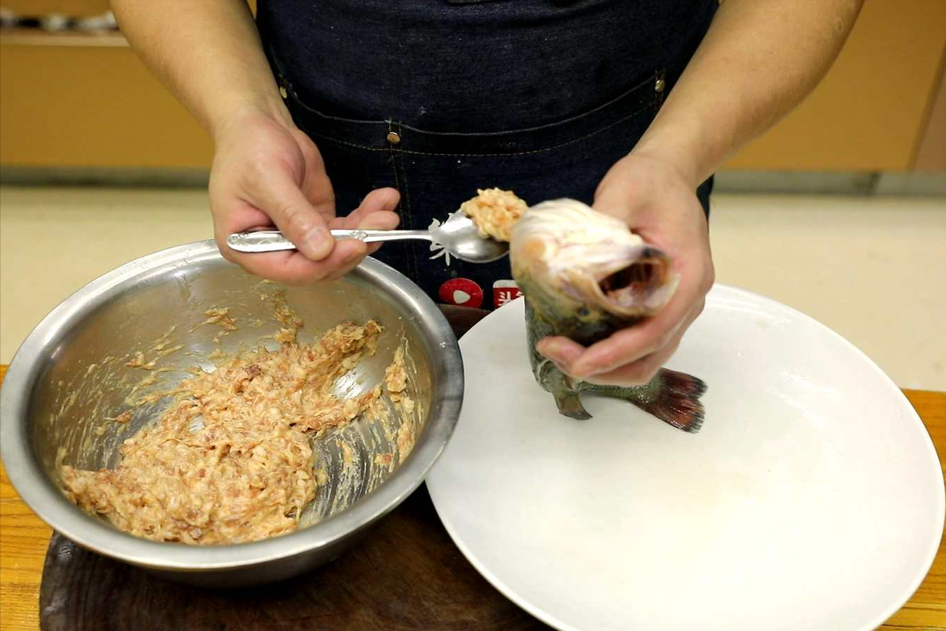 2.然後把調好的肉餡,一勺一勺的塞在魚肚子裡面。兩根蔥墊底,把鱸魚放上面。蒸鍋中上大氣以後,把鱸魚放進去。