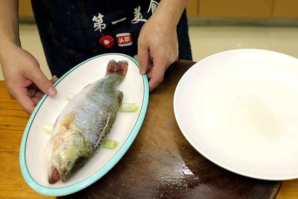 3.旺火蒸10分鐘,蒸魚一定要水寬、火旺、蒸汽足,肉質才緊實滑嫩。10分鐘以後咱把蒸熟的鱸魚取出來,裡面的蔥段連汁都要倒出來,腥味特別重。