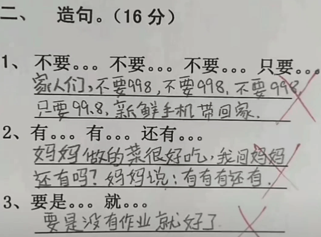 這確實是大人們之間經常發生的事情,可是老師卻不忍細看,認為這孩子真的是被父母教壞了,完全沒有學到一點點正面案例。一旦小學基礎知識打不好,那麼滿屏的紅叉基本上就沒跑了。