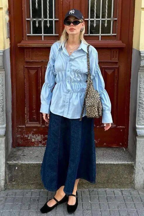 丹寧裙+金屬扣瑪麗珍,休閑中帶點精緻,不邋遢也不刻意;