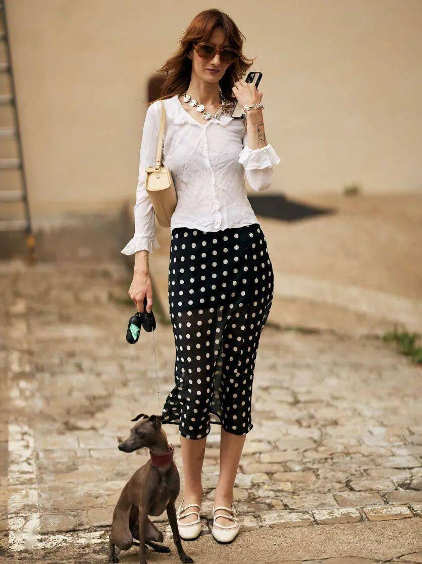 波點半裙+基礎款瑪麗珍 ,鞋型的乖巧能壓住印花的跳躍,甜得恰到好處;
