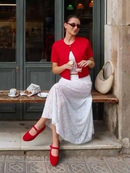 簡約小白裙+紅色瑪麗珍,一秒穿出法式電影氛圍,不用費力拗造型,慵懶又上鏡;