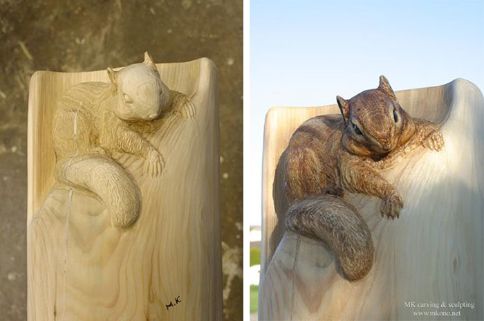 在森河野的作品集中可以看到,那些一個個雕刻出來的活靈活現動物環境都是他精心做出來的,在外媒《awesomeinventions》的報導下,光是一組松鼠、一組兔子就要從描繪、塑形、並在周圍如巢穴的地方刻畫出來,光看就覺得不容易。