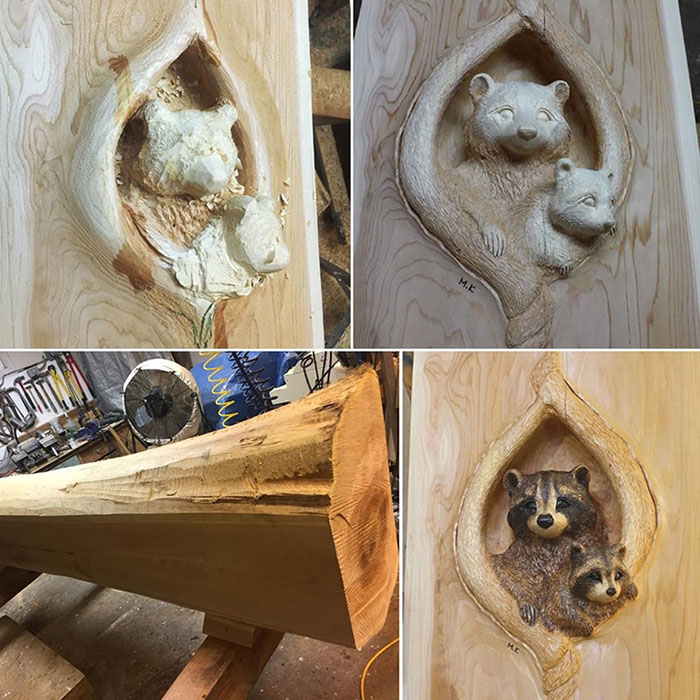 此外如此熱愛木雕服務的他,近年更專注於開創更多新的複雜細節,比如浣熊身上的深淺毛色與紋路,視覺上把自然之美與木雕結合起來,不說還以為是真實的!
