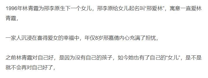 而就在林青霞結束蜜月旅行的第二天,她便迎來了6歲繼女邢嘉倩的發難。