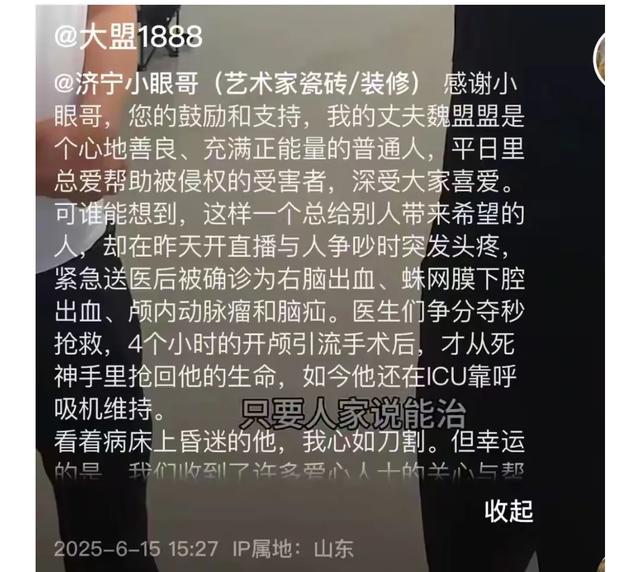 2025年6月16日,濟寧網紅「大盟1888」妻子李靜姝女士在社群平台發布了訃告,自己的丈夫魏盟盟,於6月13日突發腦出血,經過醫院全力搶救四天後不幸去世,年僅32歲,留下妻子和年幼的孩子。