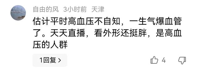 另一位網友表示,估計是平時有高血壓,一生氣就血管爆了,天天要直播,體型還有些肥胖,看起來像是高血壓的人群。