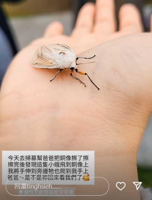 正當他們忙著打掃時,一隻飛蛾突然現身,停駐在銅像上,更令人驚訝的是,當謝金晶將手伸出時,這隻飛蛾竟乖巧地爬上她的手,這意外的互動,讓她不禁潸然淚下,選用江蕙的《祝福》當背景音樂,感性地說:「爸爸,是不是祢回來看我們了...」