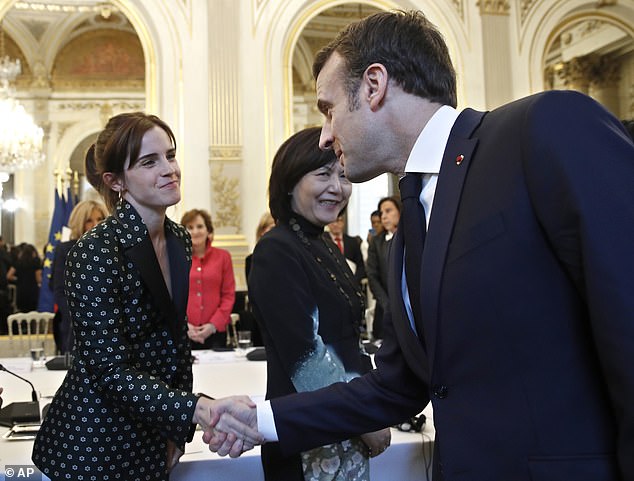 難掩興奮神情的艾瑪華森當天看起來走路有風,也在會場接連和法國總統馬克宏(Emmanuel Macron)和第一夫人碧姬(Brigitte Macron)握手致意!