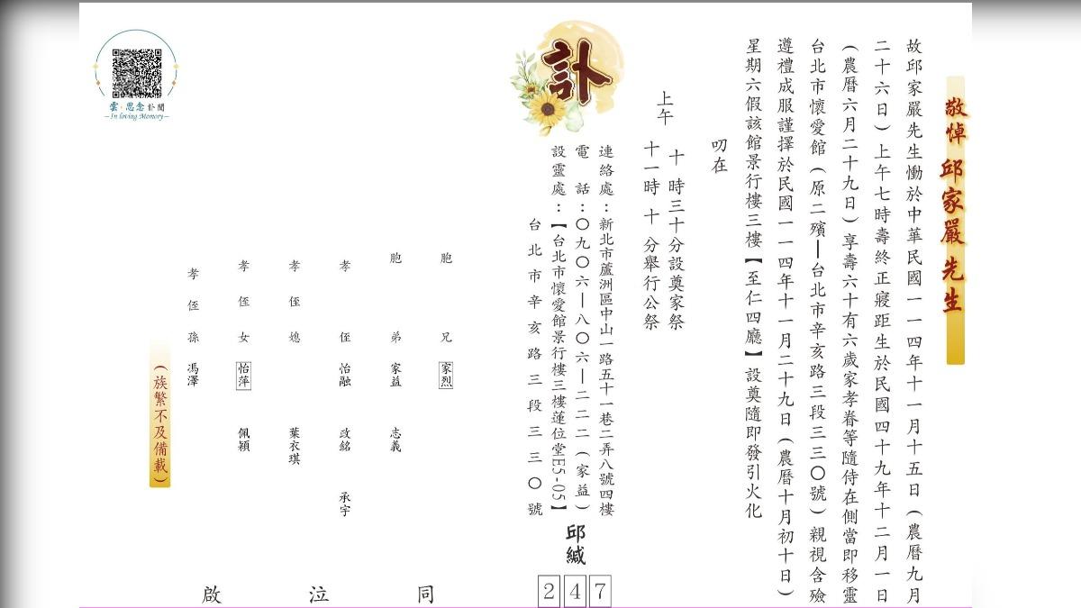 演藝圈大咖「驚傳身亡」死因曝光!陳淑芳、恬娃「證實噩耗哀悼」:送祂最後一程... 長腿弟弟 2025-11-22 檢舉 圖片來源:呂俍慧 臉書邱家嚴在電視圈耕耘多年,製作過多檔膾炙人口的節目,不僅專業能力備受肯定,待人處事更是深獲同業敬重。如今傳出他不敵病魔摧殘而離世的消息,令眾多演藝圈好友深感不捨,紛紛在社群平台留言悼念,希望他一路好走。感謝祂生前在電視節目中的付出!一路走好。資料來源:TVBS新聞網 Advertisements 回首頁 2/2 Advertisements 編輯精選推薦 More + 相差18歲!58歲康康自爆「與老婆分房12年」驚呆眾人 提到沈玉琳「坦言罹同1病」:必須警惕... 交往7個月就閃婚!小17歲妻遭質疑「嫁沈玉琳是為了錢」 婚後負債3千萬「芽芽一句話」網看哭 旅美多年!資深女星「堅持落葉歸根」回國5天安詳離世 死前「砸600萬做1事」眾人淚目 22歲愛女病逝!資深男星「走不出喪女痛」留白長髮現身 掛骨灰項鍊「代女做1事」惹淚 婚變尪落跑!單親媽「獨扛千萬債養孩」到處躲黑道 「一開口驚艷眾人」熬成台灣歌后 晚年兒孫滿堂!73歲影壇大哥「拄拐杖現身」腳步蹣跚 兒子「全程攙扶不喊累」網羨:又帥又孝順 最新/3度中風送醫!資深男星爆離婚「斷50年髮妻」 「砸1億淨身出戶」家族爆紛爭 晚年隱居台東!68歲名主持失蹤「車內身亡」 伴侶悲曝「死前做1事」:還掛念著我 趕在40歲前閃婚!八點檔女星「宣布嫁給他」 尪驚人身分曝「媒人是柯叔元」 再婚2年了!43歲李燕突喊「當媽媽實在太辛苦」 認「已經有愛的結晶」:最完美的幸福❤️ 慘遭飛車拖行!八點檔男星「臉全磨爛」驚悚畫面曝 目睹女星「崩潰嚇哭」頻發抖 85歲失智父身亡!林葉亭突宣布「皈依佛門」 遇大師「開示一番話」忍不住淚崩 大咖男星妹妹出嫁!全身金飾「曾獲近千萬豪宅」嫁妝豐厚 兄妹長超像「一看媽媽懂了」:基因強大 慶祝17歲愛女畢業!53歲大咖「兒女皆讀名校」年花千萬 驕傲「她獲三大獎」:又美又自信 台語歌后慟別摯愛!告別式上認「早隱瞞病情」 道歉哭喊:原諒我簽放棄急救 最新/賈靜雯深夜慟曝「她已離世」 淚PO合照喊:真的好愛你... 24歲兒失明!于美人爆「他在飯店掃廁所」維生 不盼紅包只求「別再花我的錢」 曾比江蕙紅!台語歌后「爆未婚生子」遭指指點點 「2次手術害癱瘓」72歲近況曝 15歲兒「睡夢中離世」!本土女星「送愛子火化」求做1事 「PO照圓滿了」:媽媽和你永不分開 功德圓滿了!台語歌后「悲曝他離世」享壽95歲 淚喊:去當快樂的神仙吧... 65歲男星獨居暴斃!大咖女星放下恩怨「送前夫最後一程」 昔遭動手6年嘆「死者為大」 瞞病情積極工作!51歲影后「住院照曝光」眼神充滿光 丈夫悲慟「臨終前吃流食」:仍盼奇蹟降臨 當年親吻1歲嬰!42年後「對方竟成巨星」同框劉德華 「超高顏值如兄弟」粉絲喊:真的差19歲? 快養不起小孩!本土男星「開計程車、斜槓房仲」 突宣布「離開台灣」:演藝圈沒工作 台灣大咖病逝「享壽83歲」!周遊告別式痛哭「認婚內出軌」:兒子很恨我...