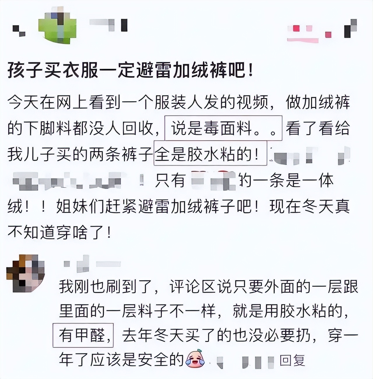 打開快遞,一股刺鼻的膠味、汽油味、霉味,就是劣質加絨褲最明顯的信號。