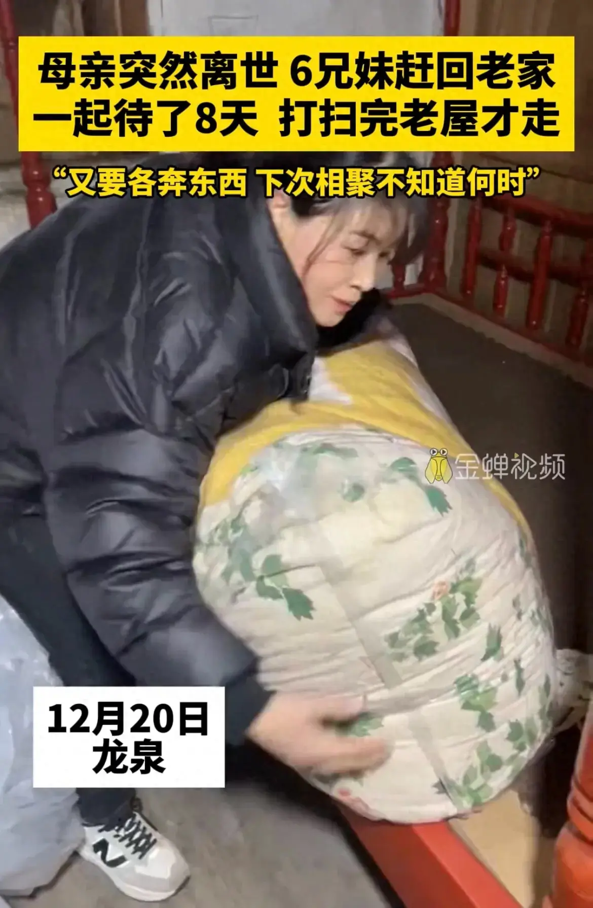 12月20日,龍泉,一女子分享母親離世,兄弟姐妹六人回家八天,打掃完老屋,大家各奔東西。網友說,沒了娘,以後就是真的親戚了。