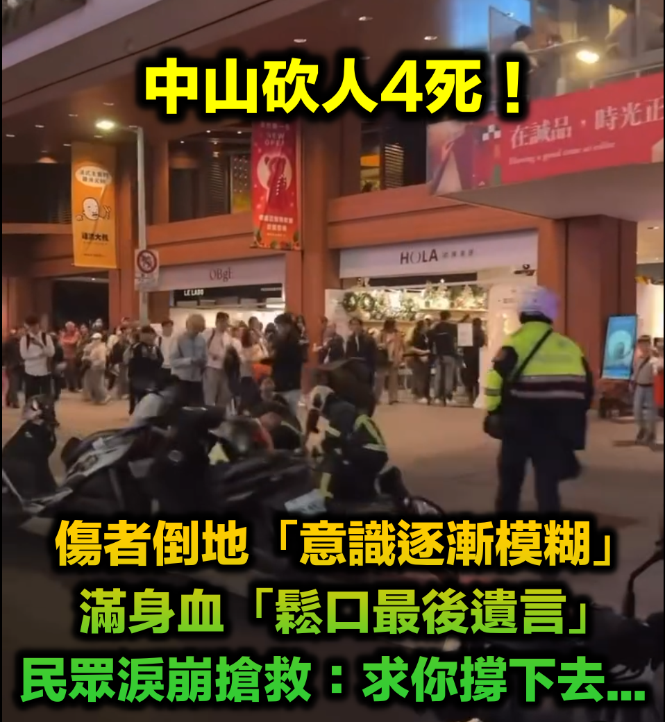 中山砍人釀4死!急救民眾目睹「傷者意識模糊」 他滿身血「鬆口最後遺言」撒手人寰... 中距離神射手 2025-12-20 檢舉 貼文來源:Threads稍早,網友又在該篇貼文下方留言,透露那名傷者最終仍離世,「他的親戚與同事有聯繫上我,我也請他們協助向他的父母轉達那句話了,他直到最後一刻都很努力撐著,我想他真的盡力了。也請大家出門在外多留意周遭安全,平常也記得多多和家人朋友表達愛,把握當下、千萬不要讓自己徒留遺憾」。 影片來源:YouTube在現場遭遇這種事真的太可怕⋯⋯。資料來源:TVBS新聞網 Advertisements 回首頁 2/2 Advertisements 編輯精選推薦 More + 85歲失智父身亡!林葉亭突宣布「皈依佛門」 遇大師「開示一番話」忍不住淚崩 空窗多年!68歲陳美鳳突羞認「身邊有個他」 40年前就認識「遭男方母親拆散」 以為只是小感冒!本土女星悲痛證實「他併發肺炎過世」 一度淚灑現場「後悔同意插管」 最新/賈靜雯深夜慟曝「她已離世」 淚PO合照喊:真的好愛你... 晚年隱居台東!68歲名主持失蹤「車內身亡」 伴侶悲曝「死前做1事」:還掛念著我 快養不起小孩!本土男星「開計程車、斜槓房仲」 突宣布「離開台灣」:演藝圈沒工作 台灣大咖病逝「享壽83歲」!周遊告別式痛哭「認婚內出軌」:兒子很恨我... 22歲愛女病逝!資深男星「走不出喪女痛」留白長髮現身 掛骨灰項鍊「代女做1事」惹淚 快訊/高中生畢旅驚傳「17死20傷」! 佛門前不清淨!中台禪寺爆醜聞「下藥昏迷師弟」逞獸慾8次 「黃安妹妹也在內」廟方回應了 快訊/北捷煙霧彈攻擊「5傷4命危」!蔣萬安公布凶嫌身分 本土劇女星生了!7年前凍卵「終於來到我身邊」 歌手尪嗨喊:生個足球隊 台海若開戰「哪縣市最安全?」 網狂推2地:「打都不會打」 相差18歲!58歲康康自爆「與老婆分房12年」驚呆眾人 提到沈玉琳「坦言罹同1病」:必須警惕... 快訊/自由女神像「驚傳斷頭倒塌」超扯原因曝光 市長出面回應了 24歲兒失明!于美人爆「他在飯店掃廁所」維生 不盼紅包只求「別再花我的錢」 坣娜癌逝追思會!280億富尪曝「愛妻生前失明、無法說話」 語出驚人「不應該孤單」:已有三婚人選 功德圓滿了!台語歌后「悲曝他離世」享壽95歲 淚喊:去當快樂的神仙吧... 婚變尪落跑!單親媽「獨扛千萬債養孩」到處躲黑道 「一開口驚艷眾人」熬成台灣歌后 台語歌后慟別摯愛!告別式上認「早隱瞞病情」 道歉哭喊:原諒我簽放棄急救 最新/北捷恐攻「中山站再添一死」最新傷亡名單曝 兇嫌「曾是空軍志願役」背景曝光 65歲男星獨居暴斃!大咖女星放下恩怨「送前夫最後一程」 昔遭動手6年嘆「死者為大」 曾比江蕙紅!台語歌后「爆未婚生子」遭指指點點 「2次手術害癱瘓」72歲近況曝 趕在40歲前閃婚!八點檔女星「宣布嫁給他」 尪驚人身分曝「媒人是柯叔元」 最新/3度中風送醫!資深男星爆離婚「斷50年髮妻」 「砸1億淨身出戶」家族爆紛爭