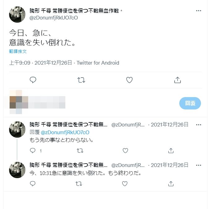 更可怕的是,石田千尋行為更加失控,但也不斷在推特上抒發心情,經常透露自己身體不適,像是「今天突然失去意識暈倒」、「最後的戰爭卻什麼都不能做」等發言,據了解,石田千尋在離開前還有更新近況,對自己信心喊話:「還可以再戰,不能放棄。」語氣仍充滿希望,可惜最終仍孤單離開!