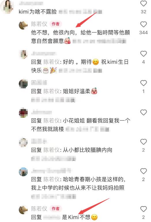 為此,這次在陳若儀為Kimi慶生動態下,有網友再次詢問:「Kimi為啥不露臉」,沒想到陳若儀竟然正面回應了。